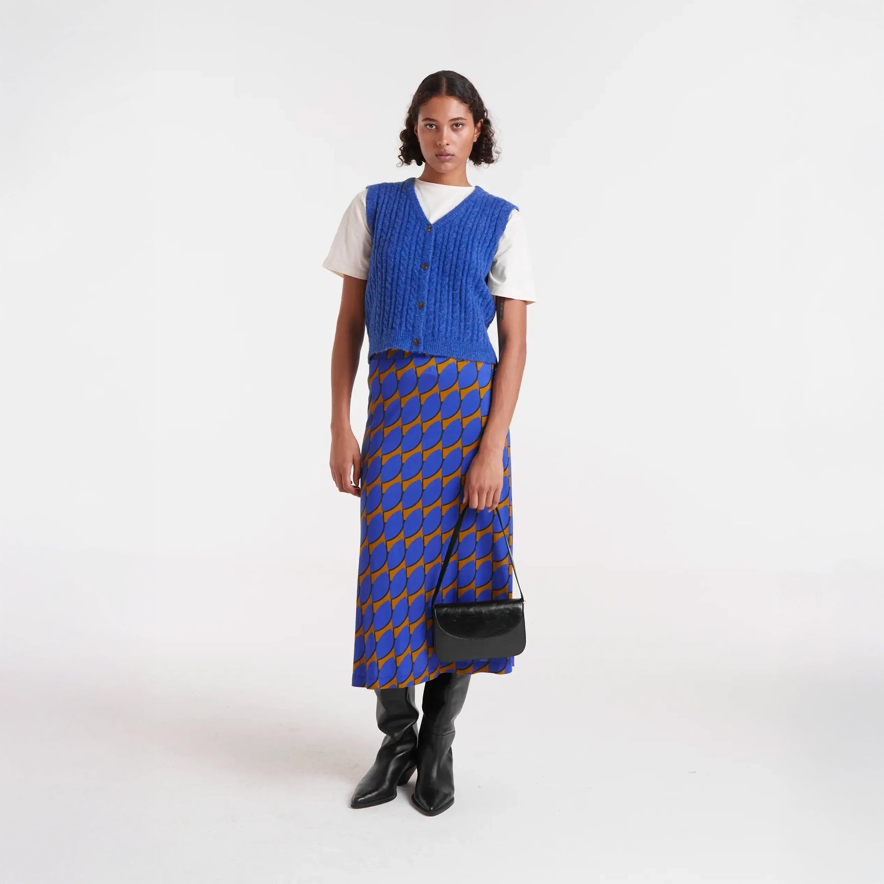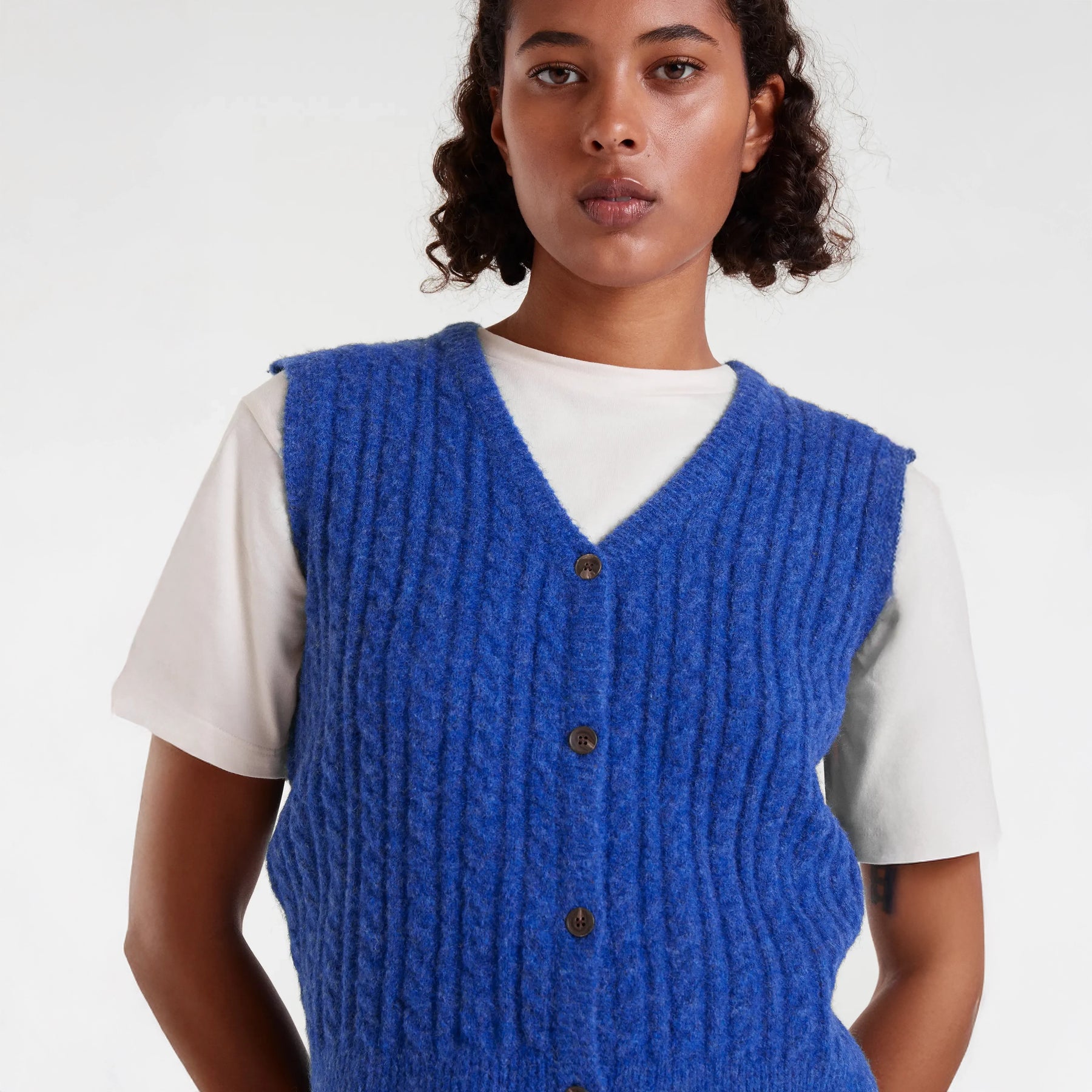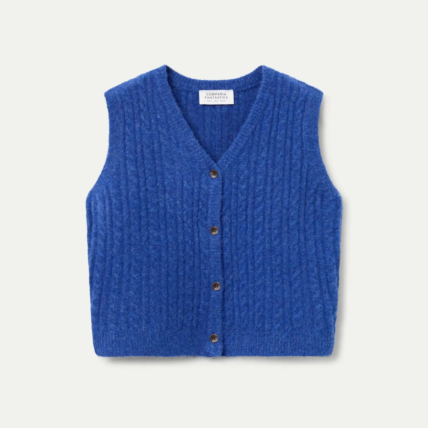 Este chaleco de punto en color azul combina estilo y comodidad con su diseño de cuello pico y ausencia de mangas, perfecto para superponer con tus prendas favoritas. Su cierre frontal con botones facilita el ajuste, mientras que los detalles en rib aportan un toque de sofisticación y textura. Ideal para crear looks versátiles que te acompañen desde el día a la noche con elegancia y calidez.