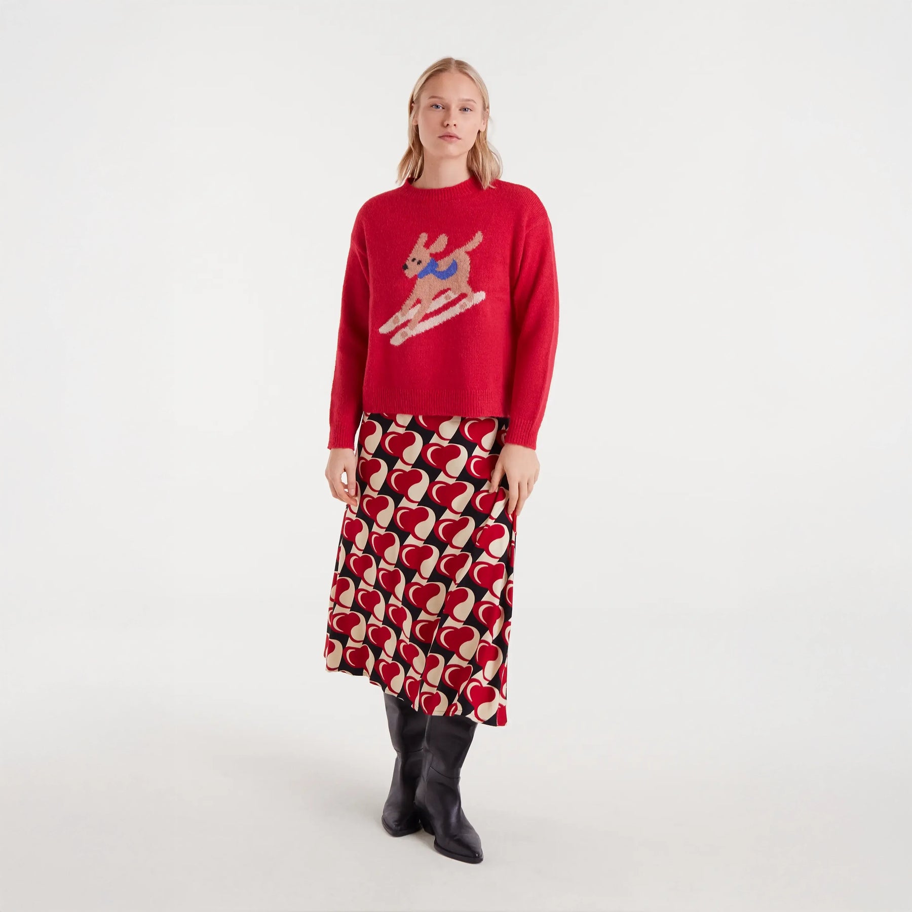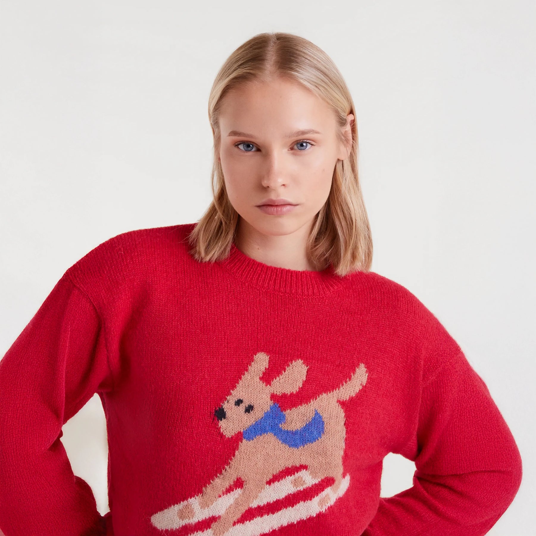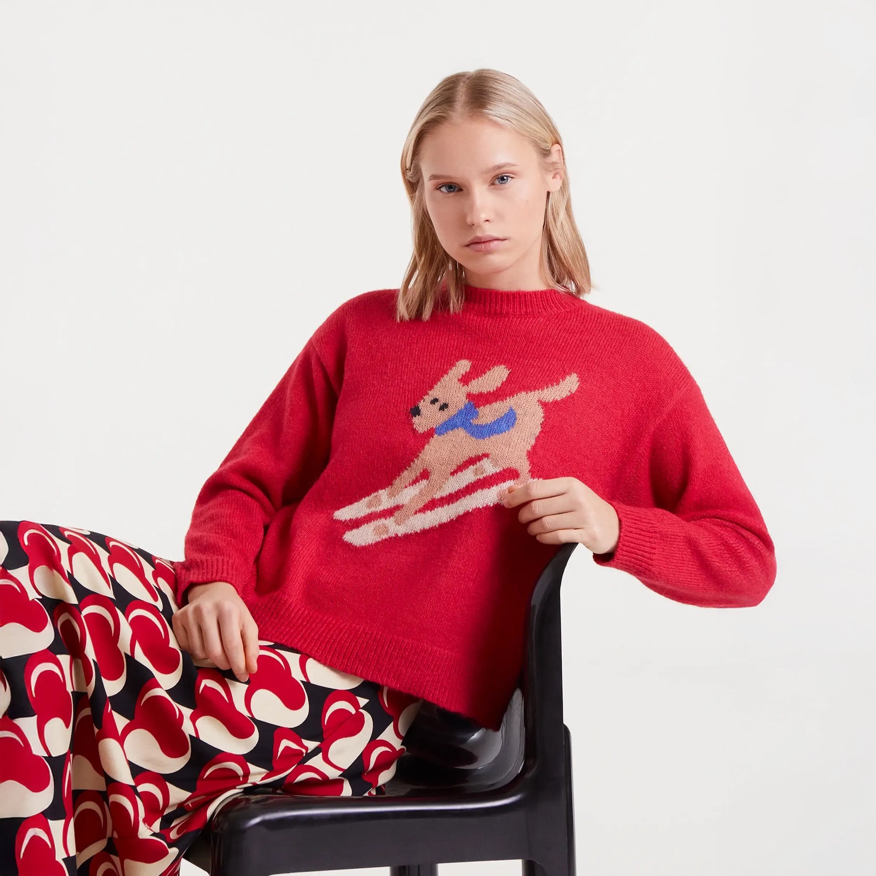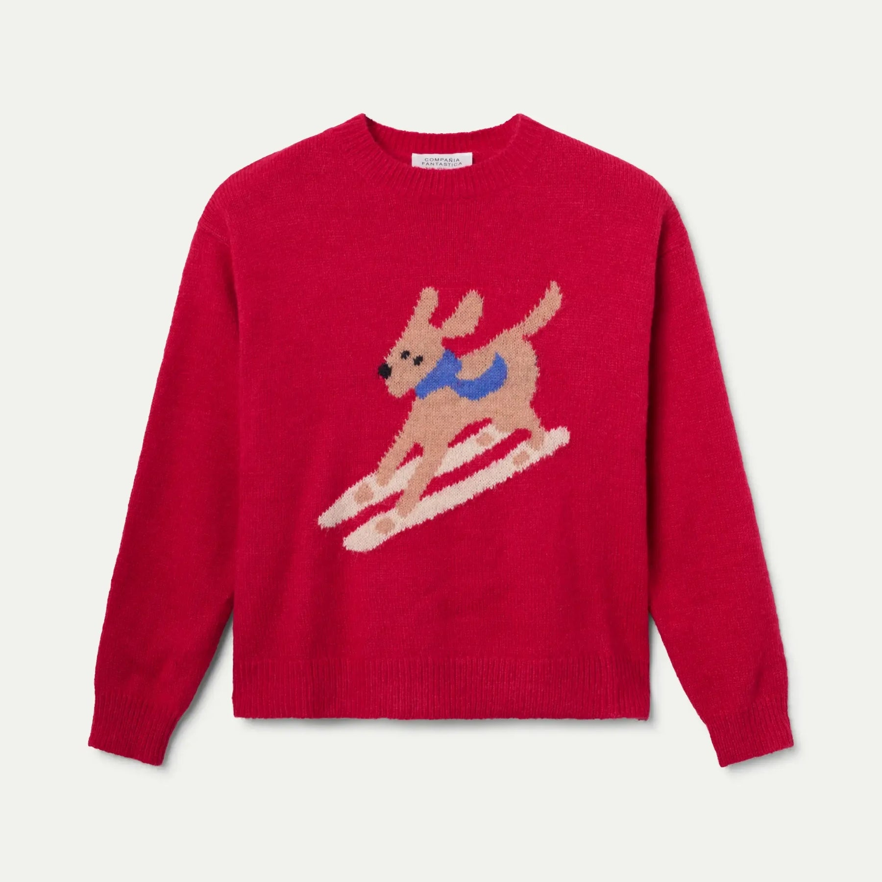 Este jersey jacquard presenta un divertido estampado de un perro esquiador que añade un toque único a tu look. Con cuello redondo y mangas largas, ofrece comodidad y calidez para el día a día. Los acabados en rib aseguran un ajuste perfecto y duradero. Ideal para quienes buscan estilo y comodidad en una prenda original.
