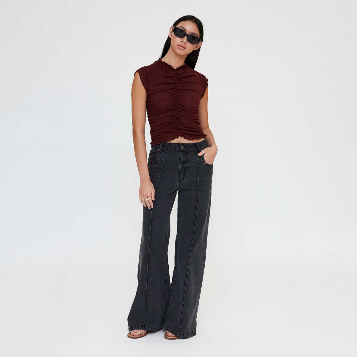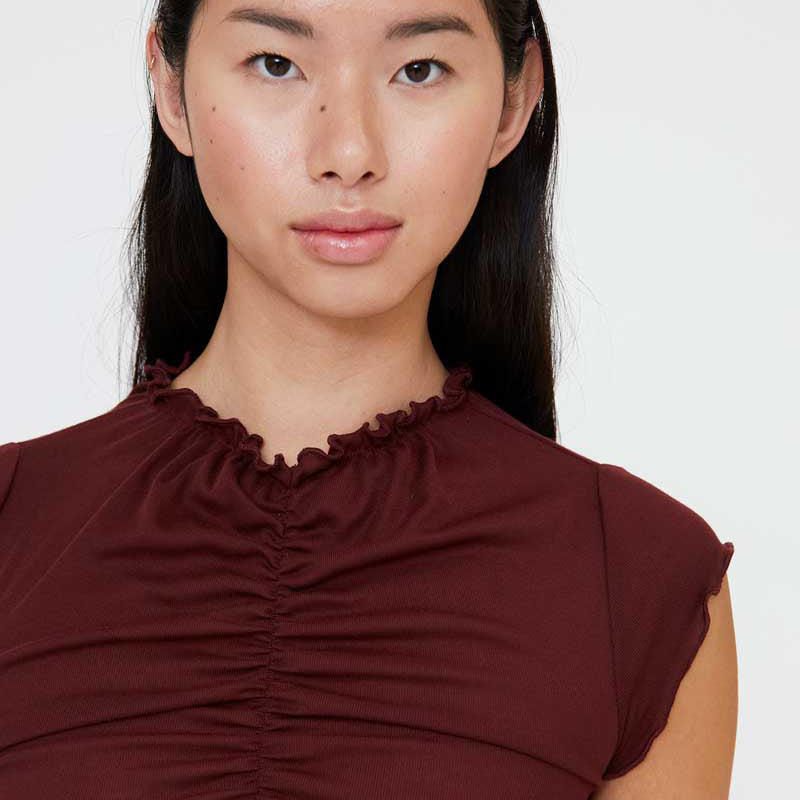 Camiseta de jersey suave en marrón que combina comodidad y estilo sin esfuerzo. Diseño versátil con cuello redondo y mangas cortas, realzado por detalles fruncidos que le dan un toque dinámico y moderno. Perfecta para crear looks casuales que funcionan tanto en el día como en la noche. La modelo de 173 cm luce la talla S, ideal para encontrar tu ajuste perfecto. Un básico imprescindible que se adapta a cualquier ocasión.