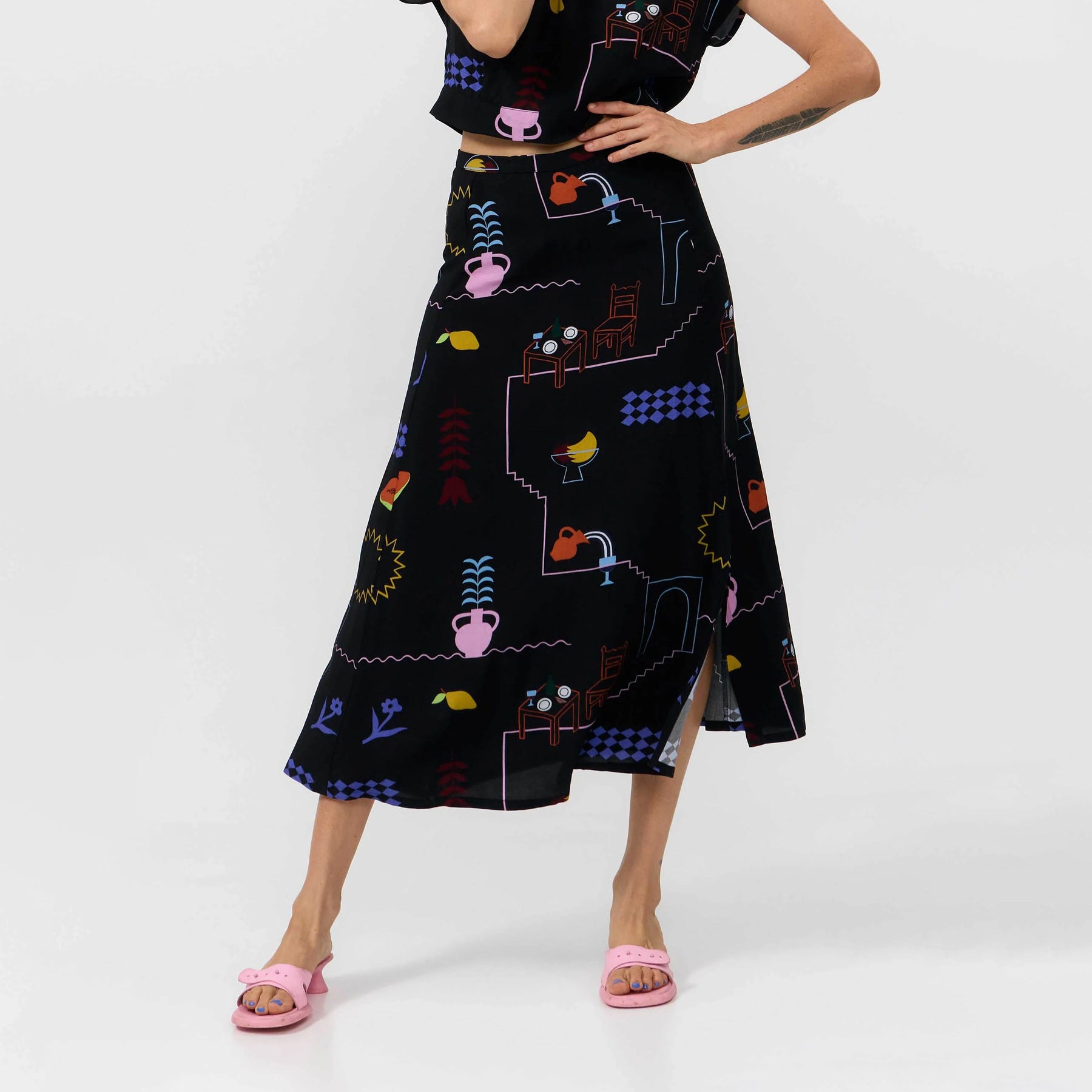 Falda midi de viscosa con estampado Borneo que combina elegancia y practicidad. Diseñada con abertura lateral en el bajo para mayor libertad de movimiento y cierre trasero con cremallera metálica oculta que garantiza un acabado impecable. Su tejido fluido y cómodo la convierte en la opción ideal para el día a día, adaptándose perfectamente a cualquier ocasión. Una prenda versátil y fiable que no falta en ningún armario.