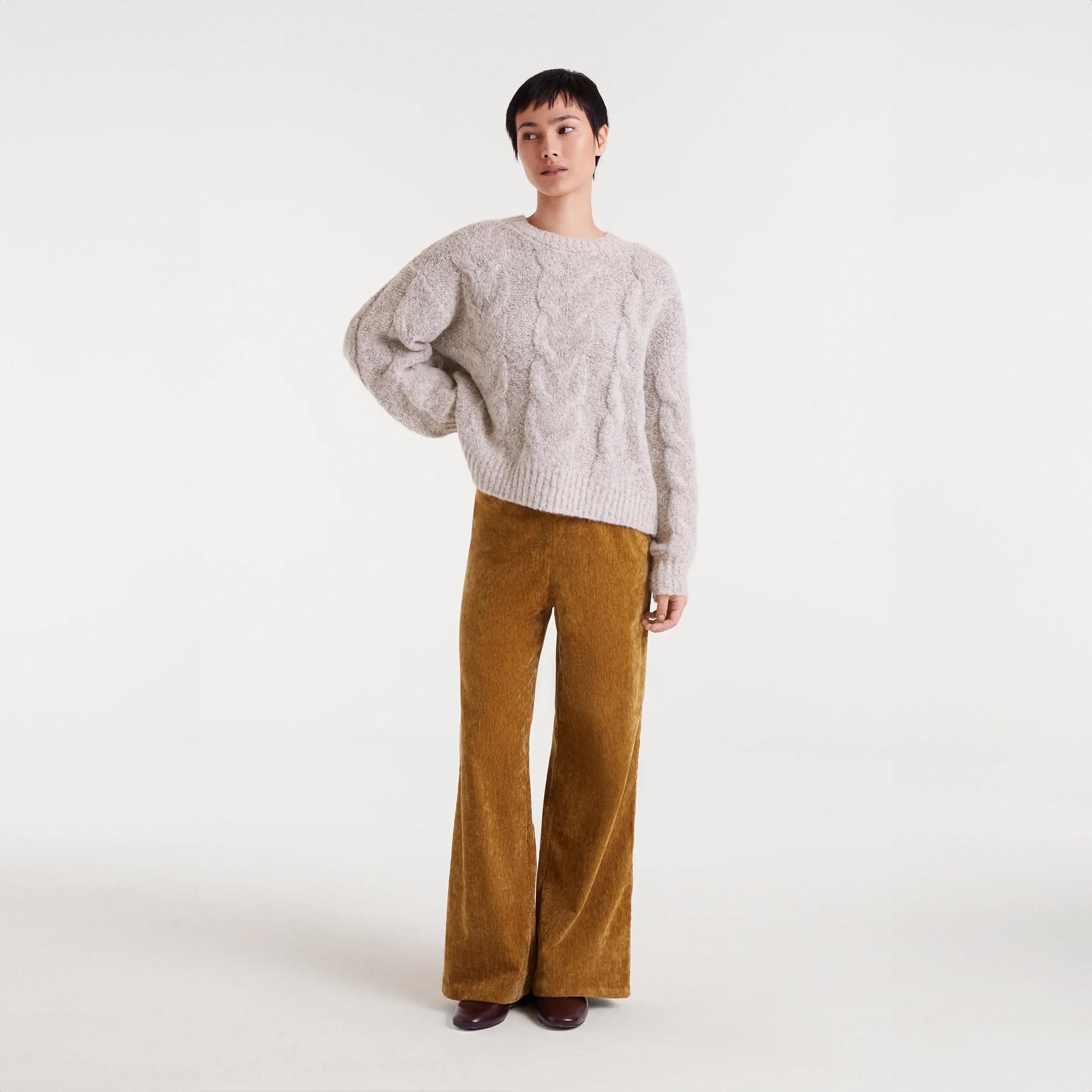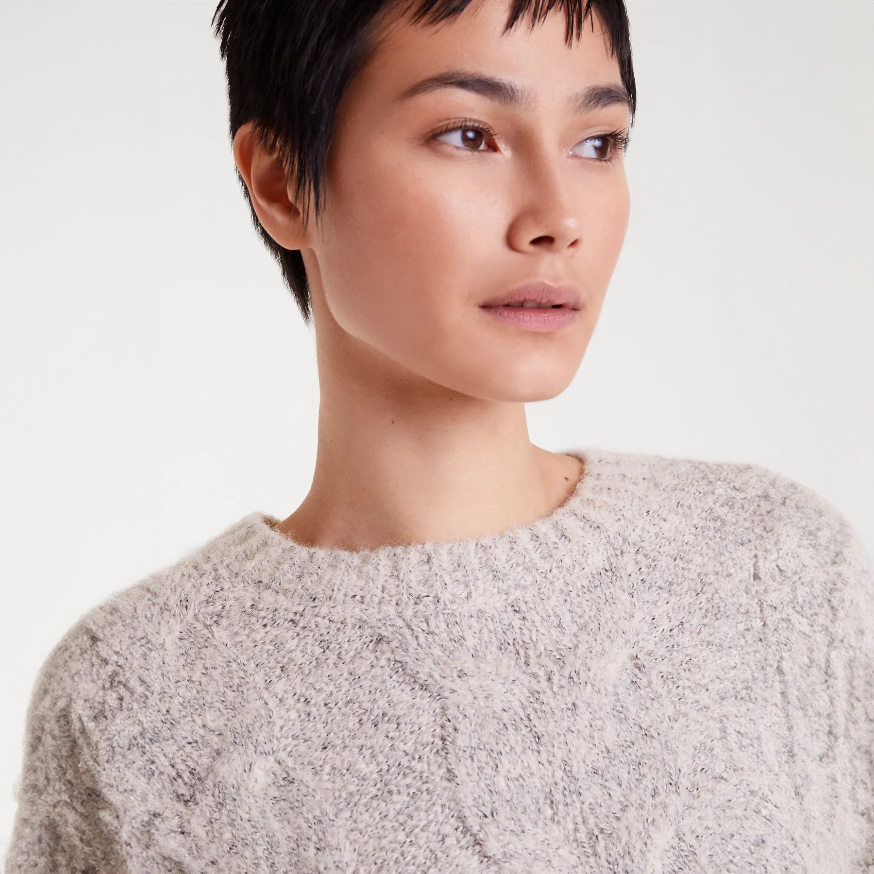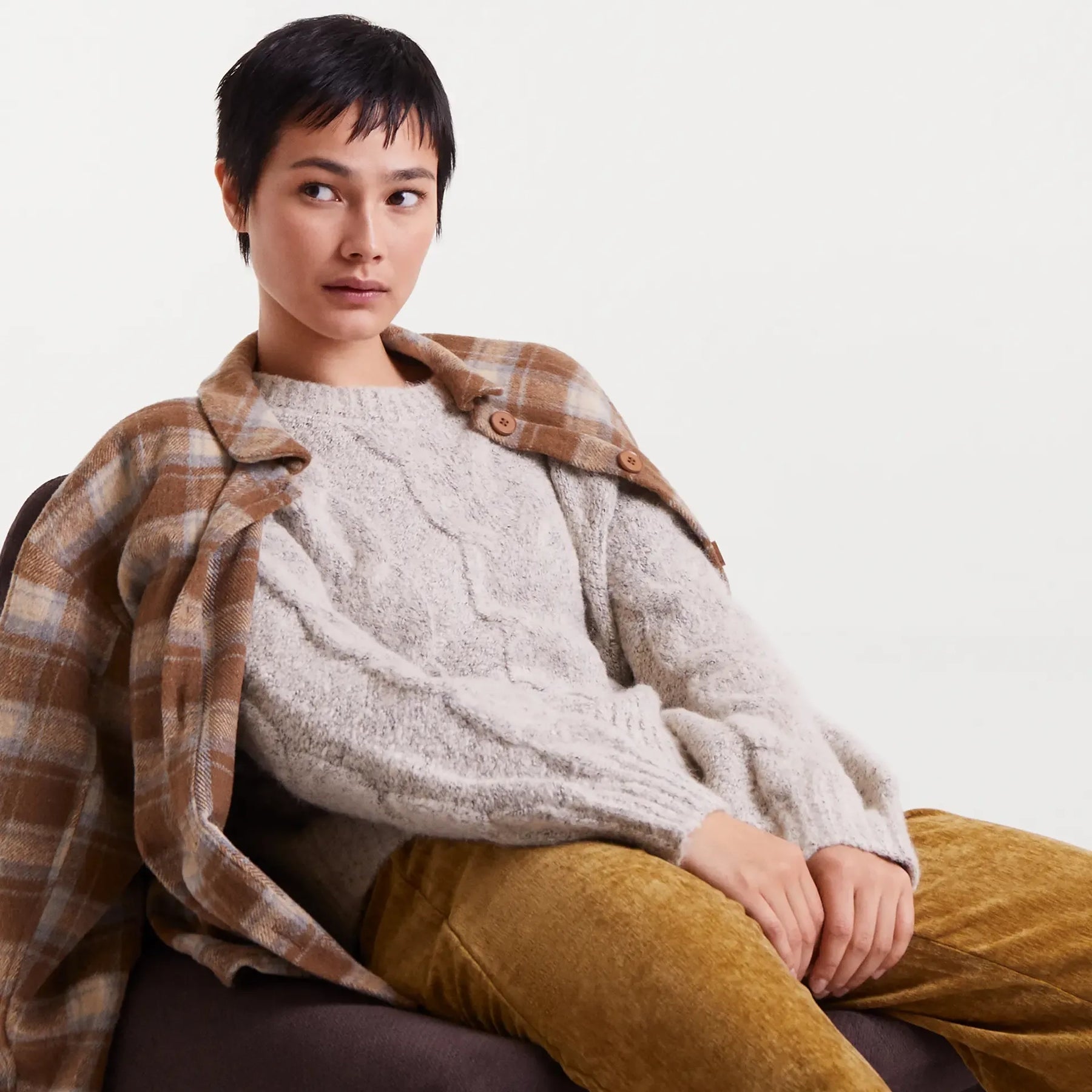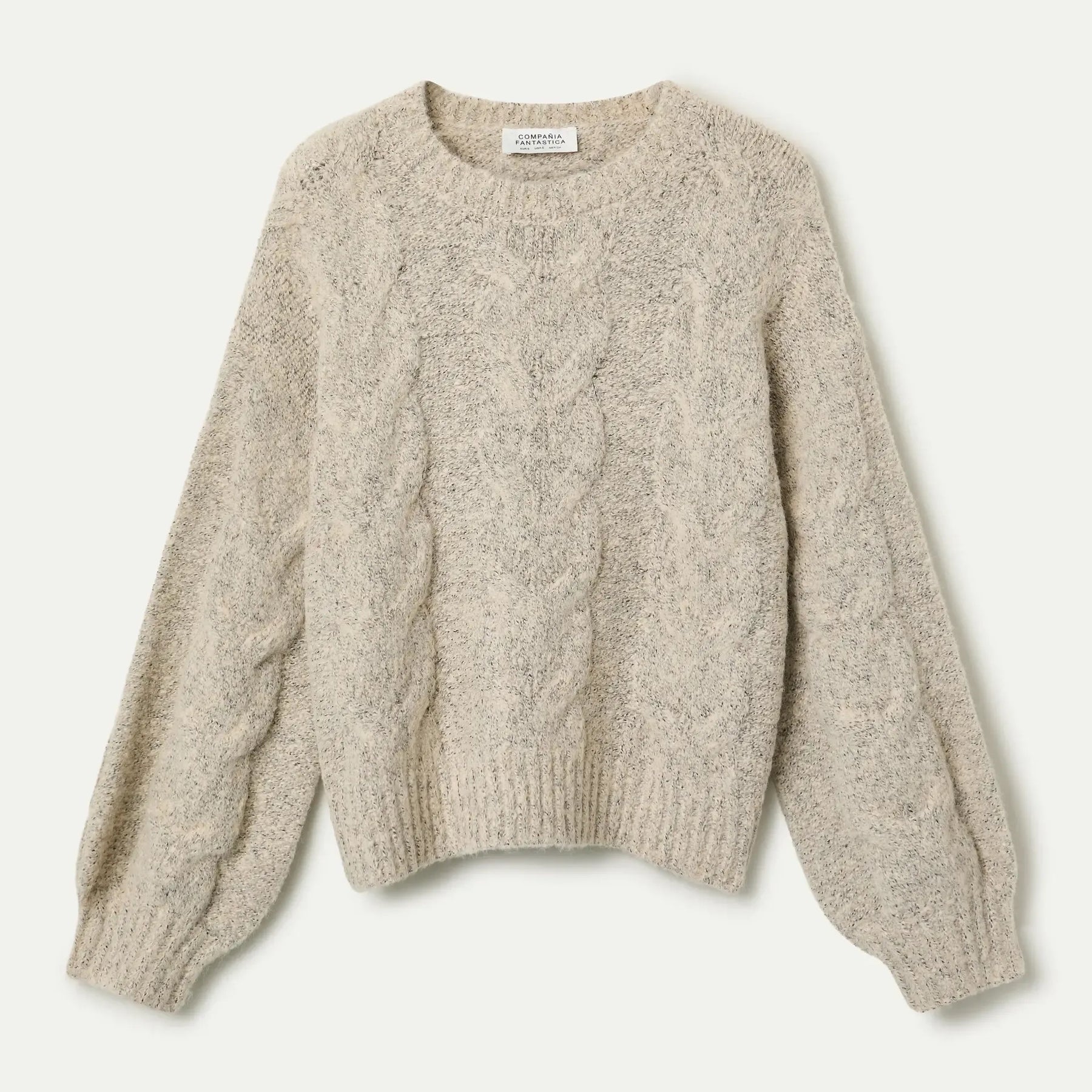 Jersey de punto encadenado en blanco que combina comodidad y estilo sin esfuerzo. Diseñado con cuello redondo clásico y mangas largas que abrazan perfectamente. Los detalles en rib en puños y bajo le dan ese toque de sofisticación que buscabas. Perfecto para capas versátiles o lucir solo en tus días más relajados. Una pieza imprescindible que funciona con todo en tu armario.