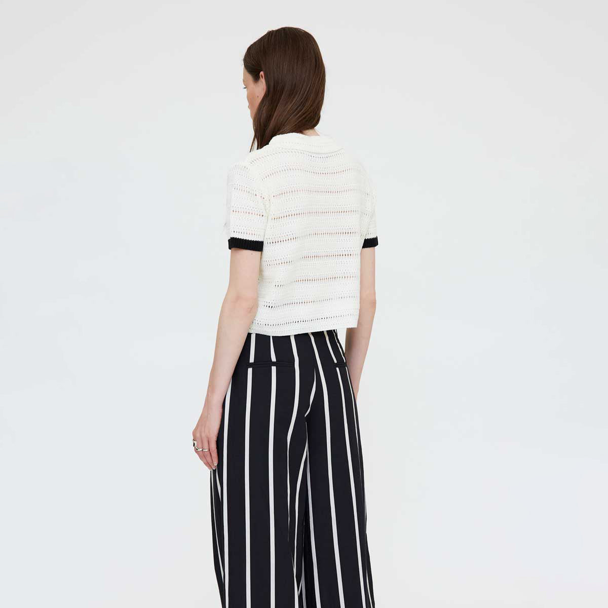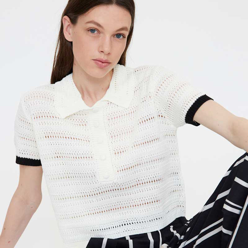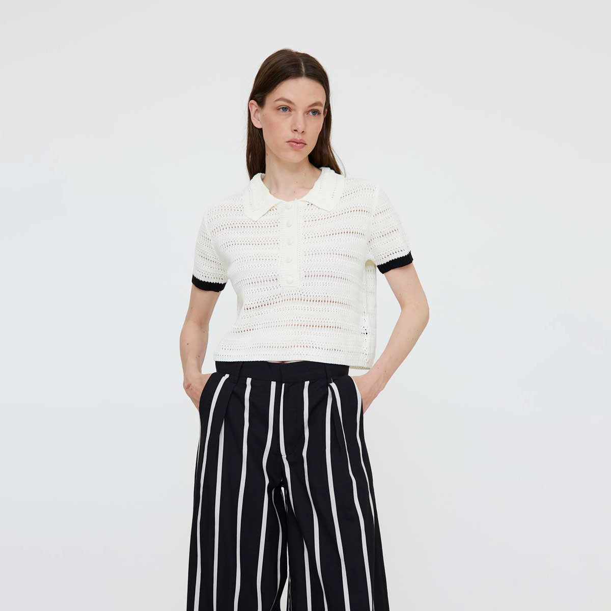 Descubre el TOP Wild Pony, un básico con personalidad que combina elegancia y diversión. Confeccionado en punto calado con efecto crochet, este top blanco respira frescura y movimiento. La manga corta lo hace perfecto para cualquier estación, mientras que los detalles en contraste negro en el cuello y la botonadura le dan ese toque de sofisticación que lo diferencia. Versátil y cómodo, es la prenda que buscabas para elevar tus looks cotidianos con estilo desenfadado.