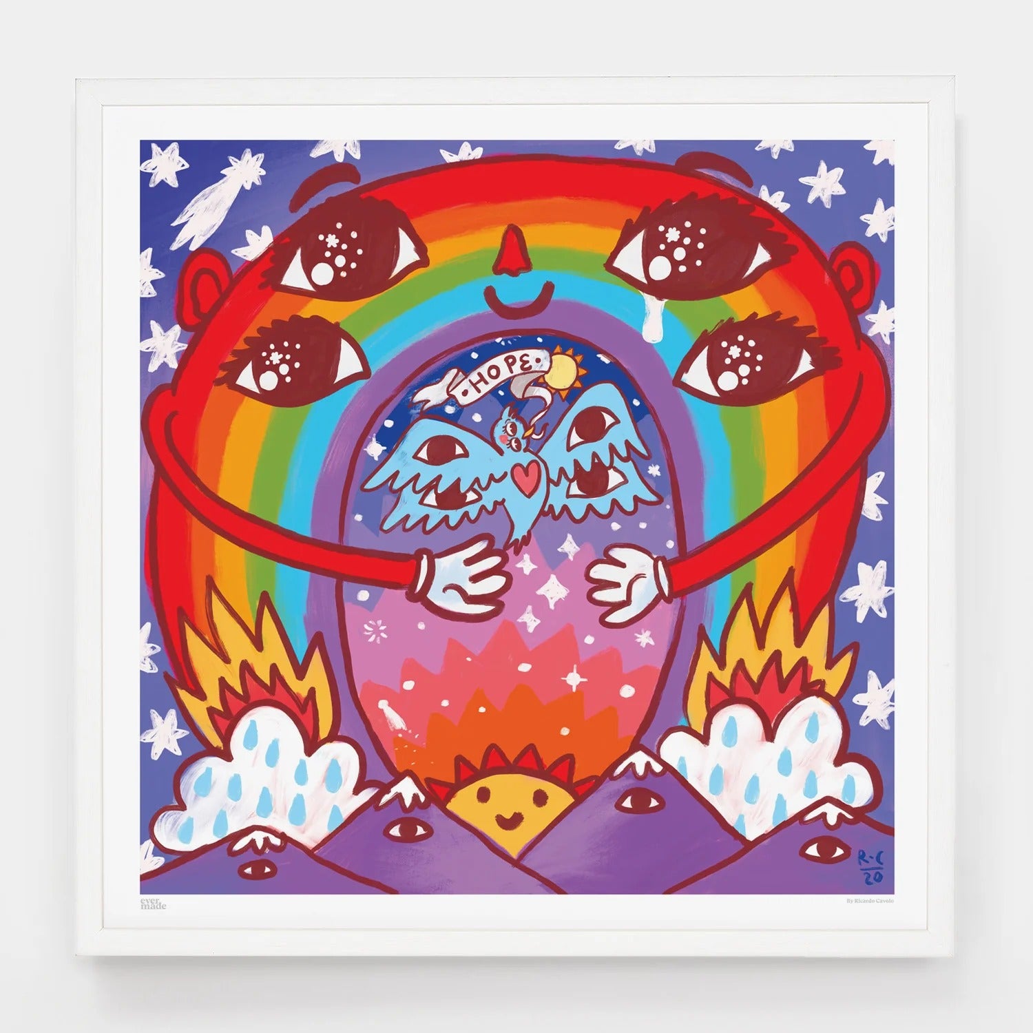 Ilustración Evermade, YES by Ricardo Cavolo Parte de la iniciativa benéfica Rainbow of Hope de Evermade, esta edición especial reúne a artistas excepcionales para crear una colección de impresiones únicas. Diseñada para apoyar a los profesionales sanitarios en primera línea, cada compra contribuye directamente al bienestar de nuestros héroes de la salud. El 100% de los beneficios se destina a NHS Charities Together. Una forma significativa de mostrar gratitud mientras posees una obra de arte inspiradora.