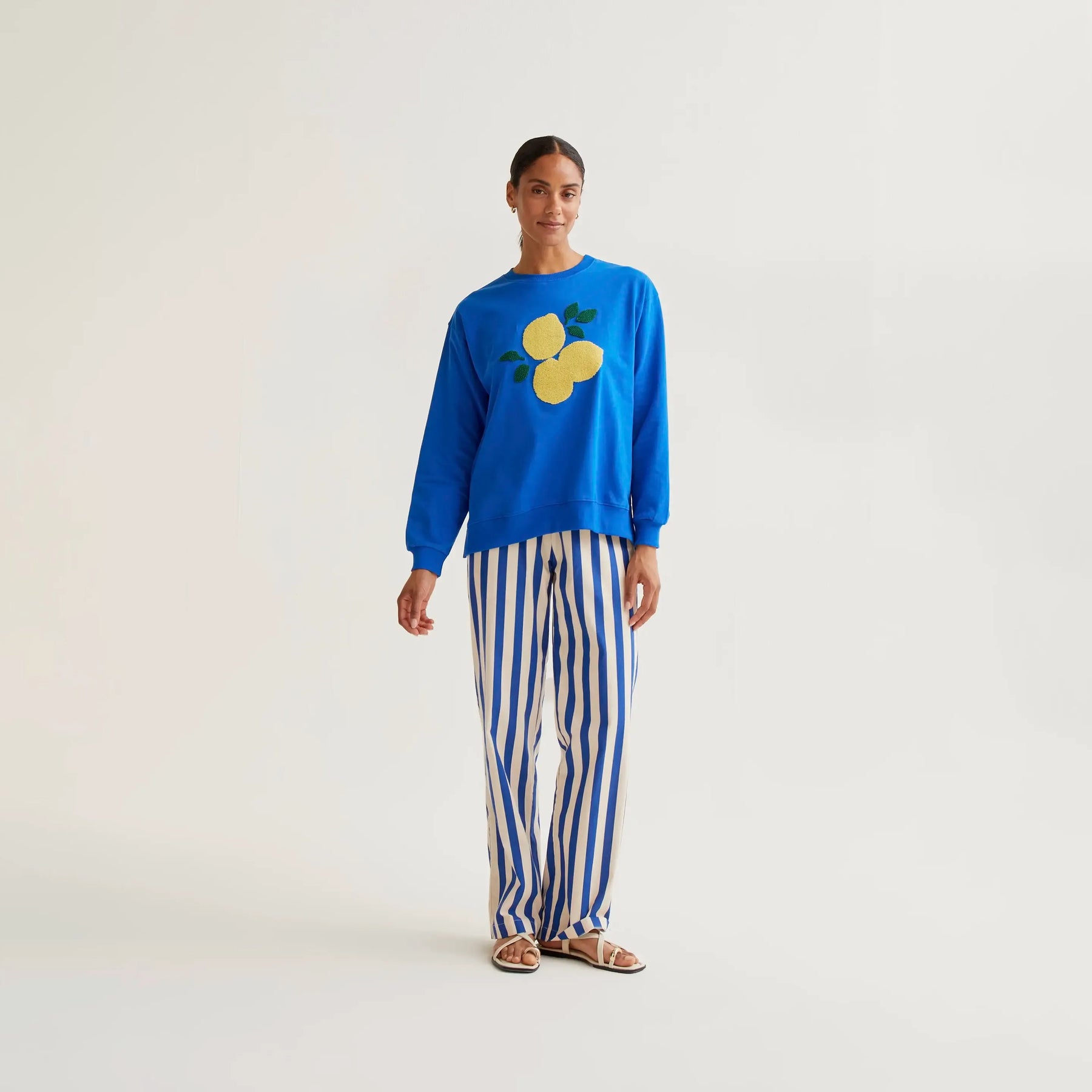 Sudadera de algodón puro que combina comodidad y diversión. Confeccionada en tejido 100% algodón, destaca por su bordado de limones gigantes que le da un toque desenfadado y original. Cuello redondo y mangas largas con hombro ligeramente caído para un ajuste relajado y moderno. Los detalles en rib en puños y bajo garantizan un acabado impecable. Perfecta para quienes buscan prendas con personalidad que reflejen su estilo único.