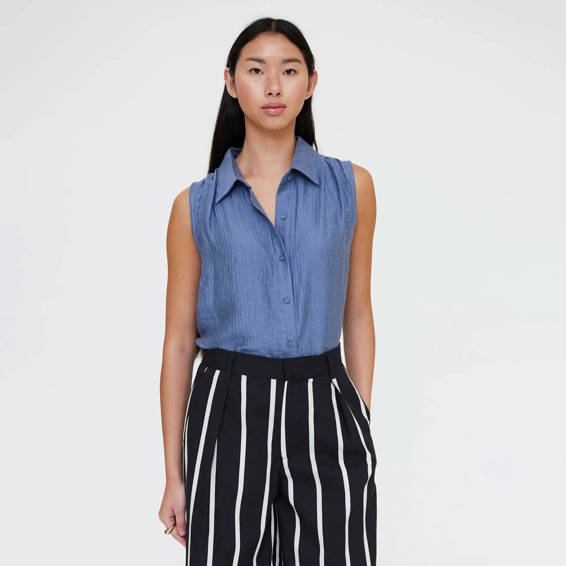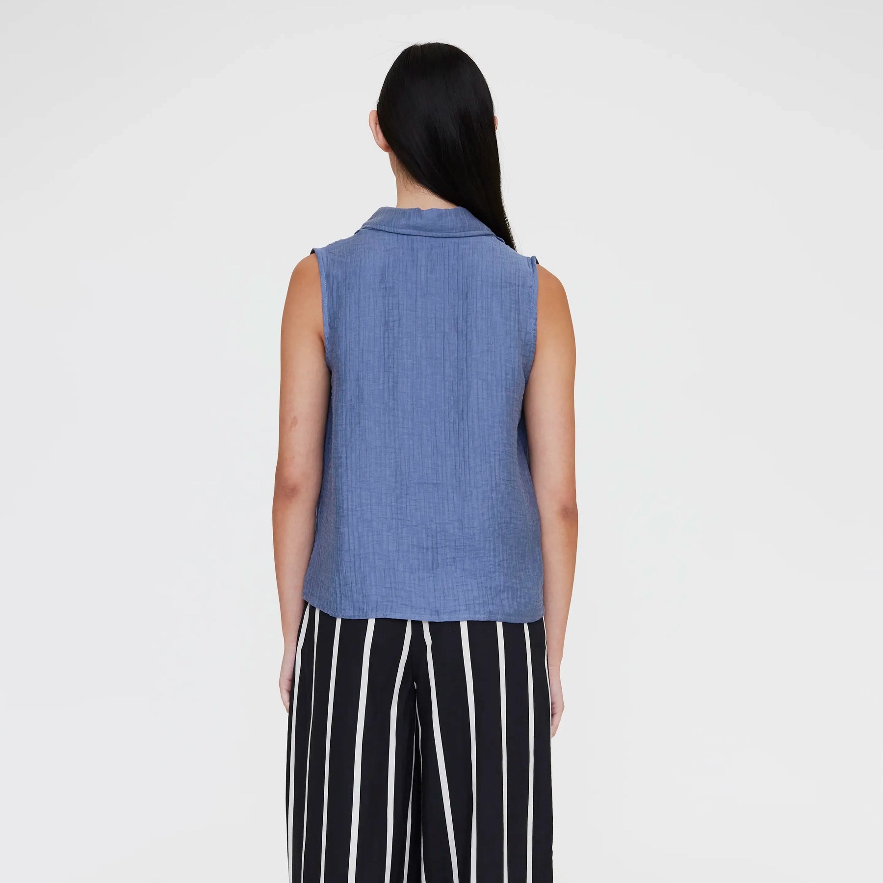 Camisa sin mangas en azul con cuello solapa clásico. Cierre frontal con botones para un ajuste cómodo y versátil. Perfecta para crear looks casuales o semi-formales durante todo el año. Su diseño minimalista y color llamativo la convierten en una pieza versátil que combina fácilmente con diferentes prendas de tu guardarropa.