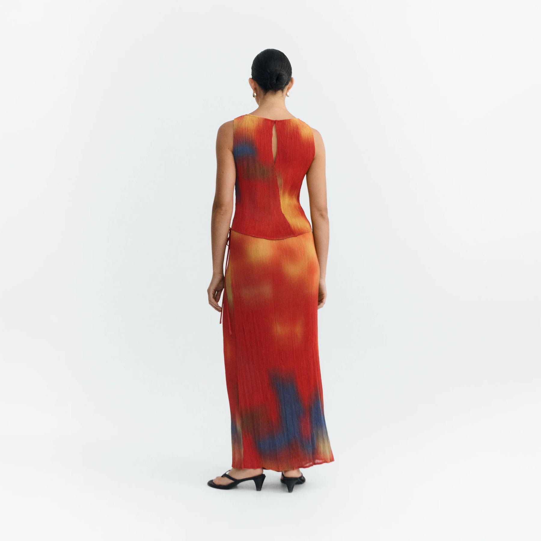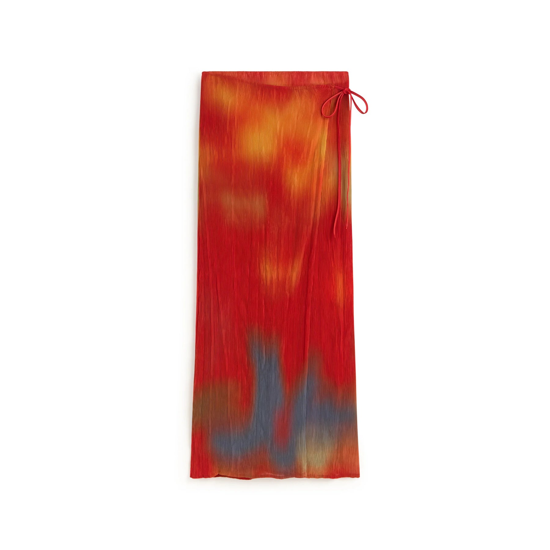 Falda larga plisada en rojo con estampado floral Pauline, diseño original de Thinking Mu. Confeccionada en poliéster reciclado de 70 gsm, un tejido ligero y sostenible. Corte slim fit que se adapta perfectamente a tu silueta, con cierre de cremallera invisible lateral para un acabado impecable. El plisado estampado le da movimiento y elegancia a cada paso. Prenda versátil que combina estilo consciente con comodidad.