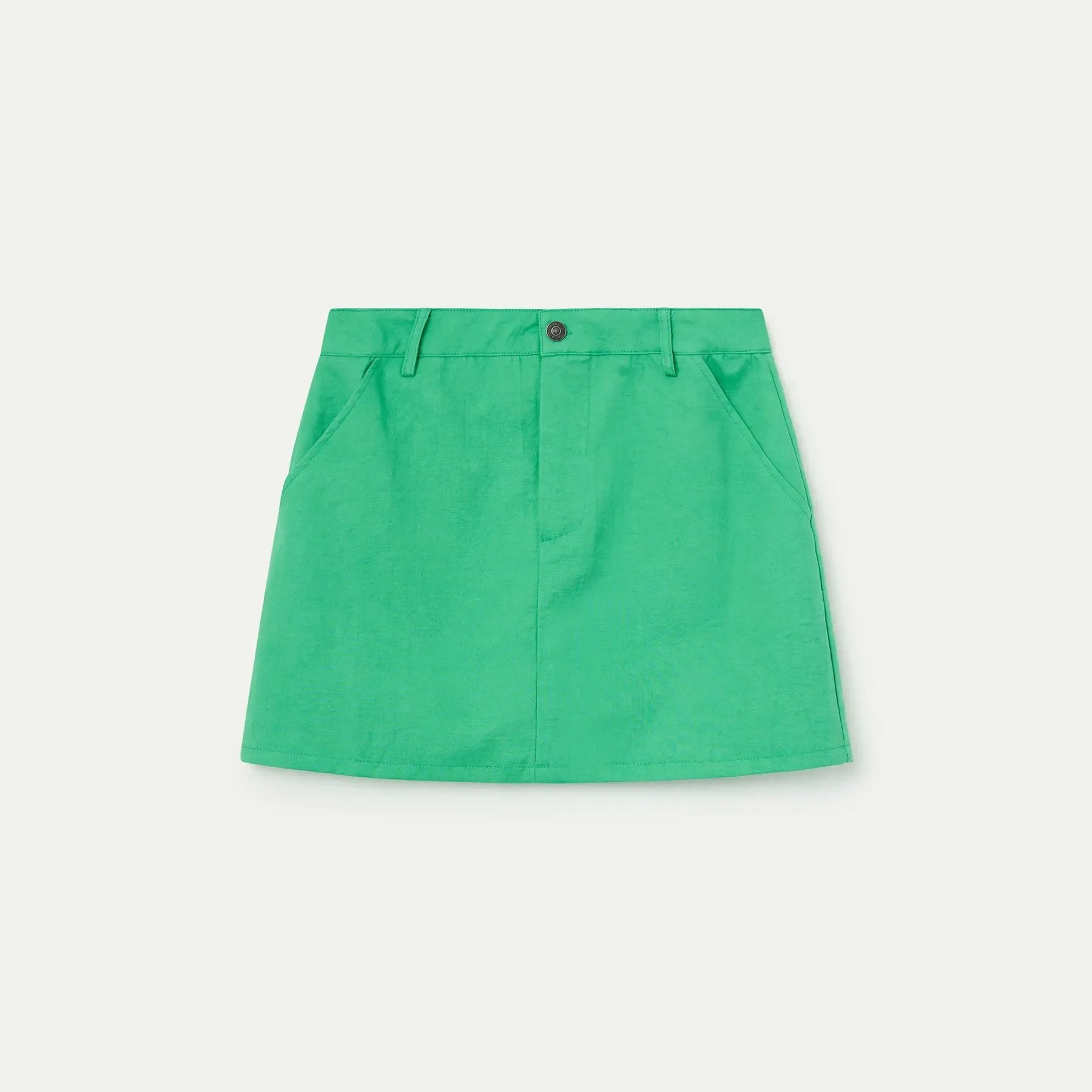 Falda corta confeccionada en una suave mezcla de lino y algodón en tonalidad verde. Diseño de tiro alto con cintura fija que proporciona un ajuste cómodo y favorecededor. Cierre frontal mediante cremallera oculta y botón para un acabado limpio y elegante. Incluye prácticos bolsillos laterales. Pieza versátil perfecta para crear looks casuales y sofisticados en cualquier estación.