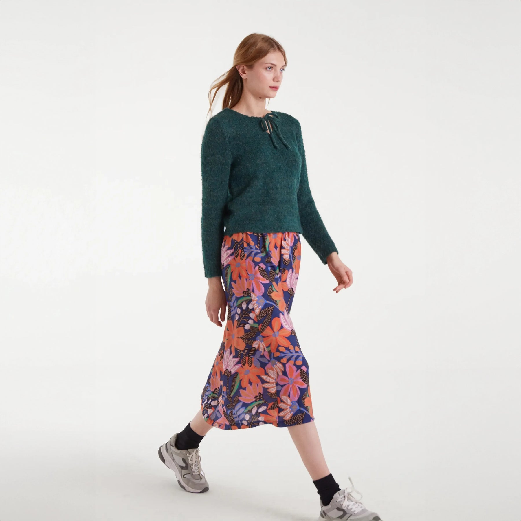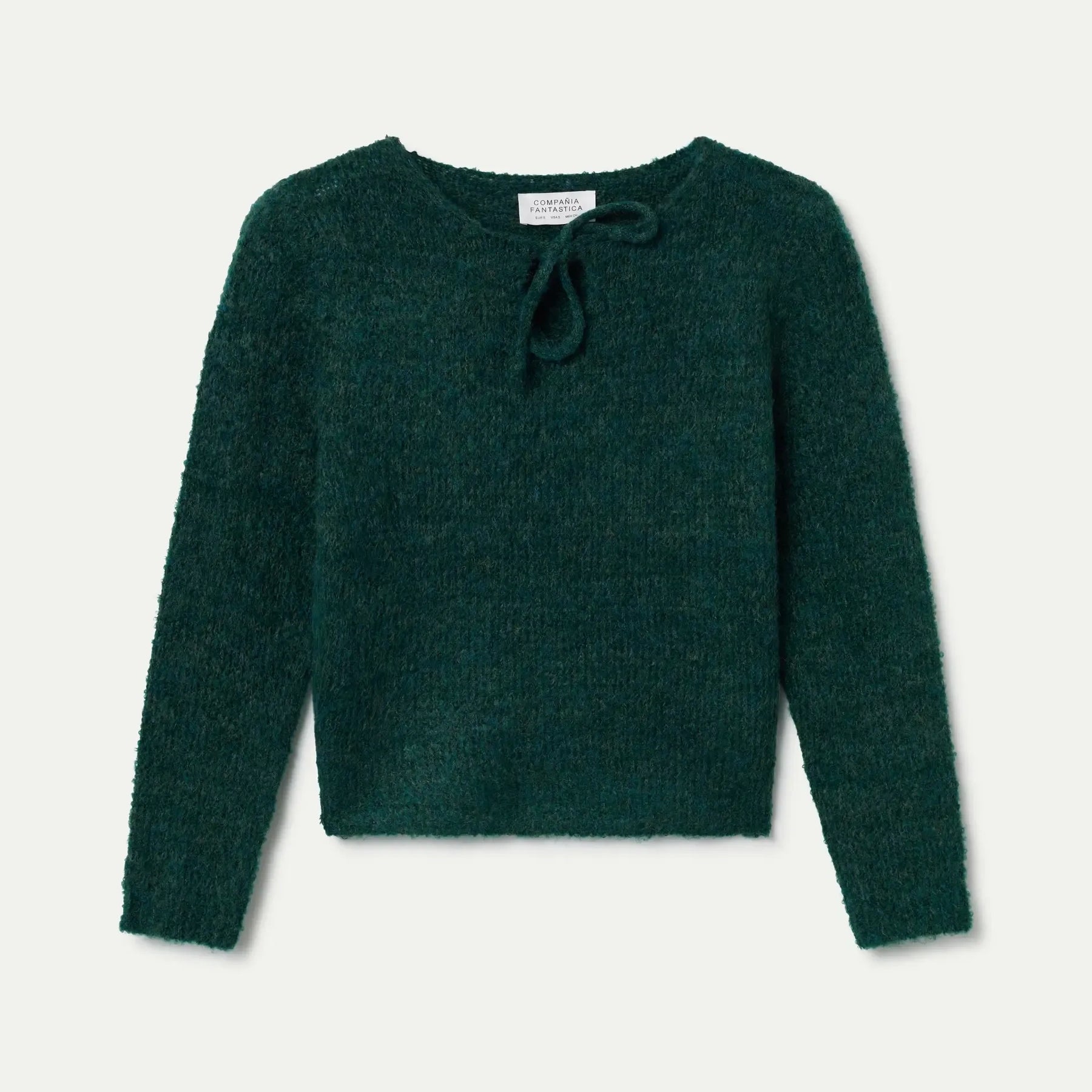 Jersey de punto con textura en verde que juega con los detalles. Cuello redondo con un escote anudado en forma de lazo que le da ese toque especial. Mangas largas para abrigarte con estilo. Perfecto para crear looks versátiles, desde casual hasta más sofisticado. La modelo de 179 cm luce la talla S, así que tienes una buena referencia para encontrar tu ajuste ideal.