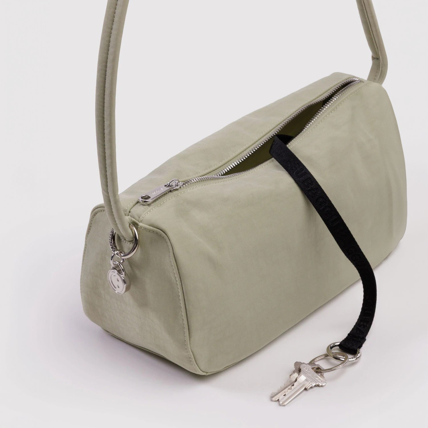 Inspirado en la forma de una barra de pan, este bolso cotidiano mantiene tus cosas organizadas y a mano. Cabe tu cartera, teléfono, llaves y botella de agua, todo asegurado con un cierre de cremallera confiable. El bolsillo interior con cremallera guarda los artículos más pequeños de forma segura, mientras que una correa para llaves mantiene tus llaves al alcance. Completa el look con el encantador dije de carita sonriente incluido, sujeto a su mosquetón.