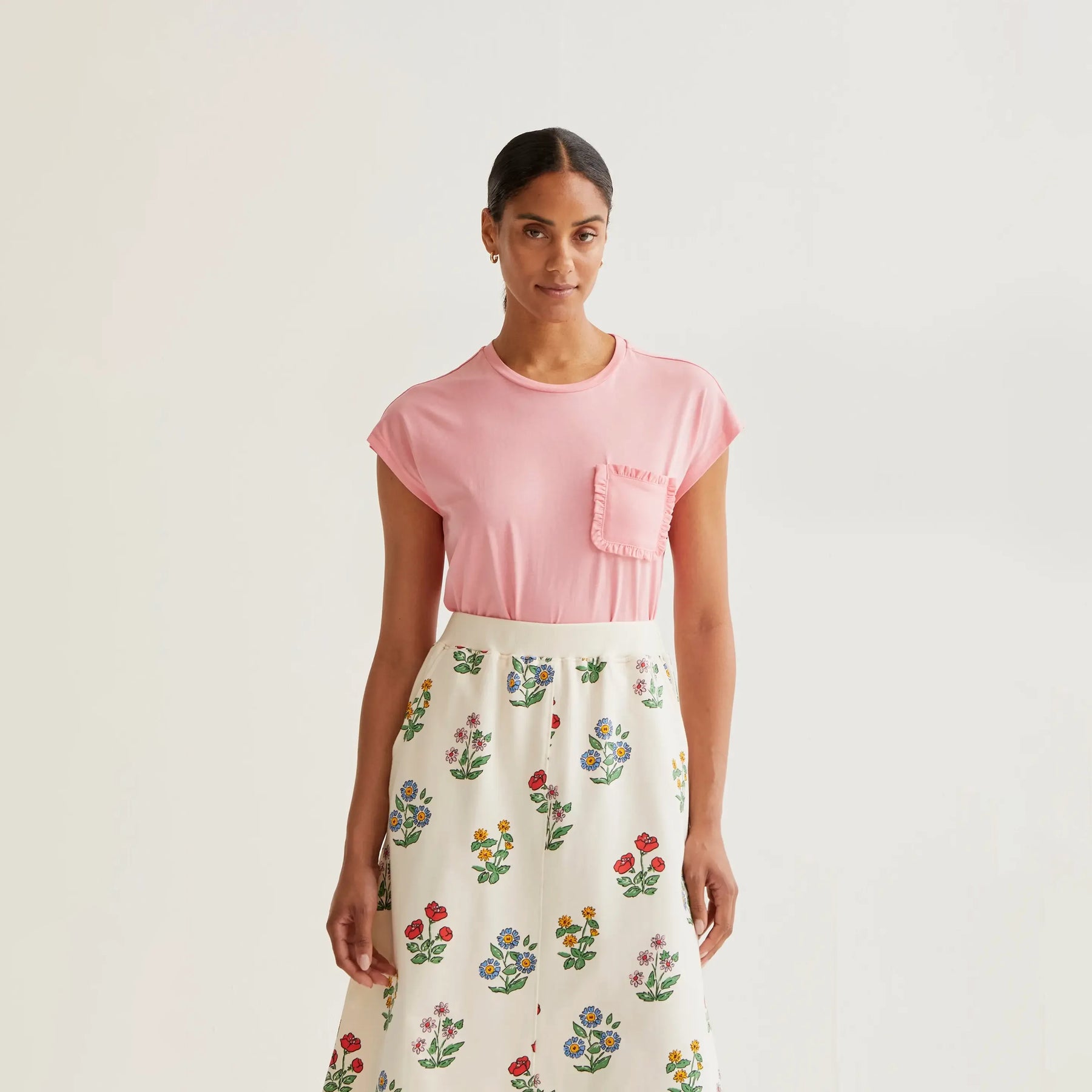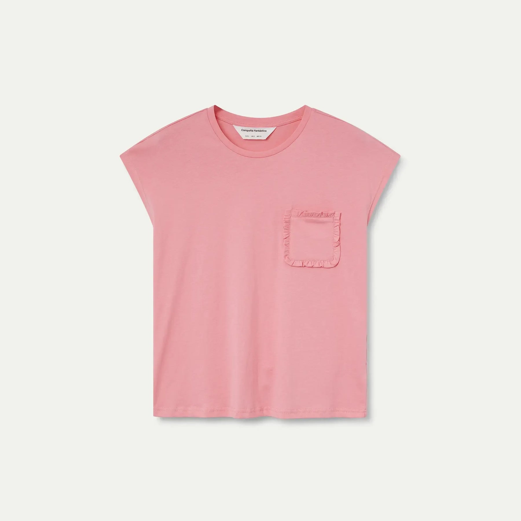 Camiseta de manga corta confeccionada en 100% algodón de alta calidad en color rosa. Diseño clásico con cuello redondo que proporciona comodidad y versatilidad. Destaca por su bolsillo frontal adornado con volantes, un detalle que añade un toque distintivo y femenino a la prenda. Perfecta para combinar con cualquier look casual.