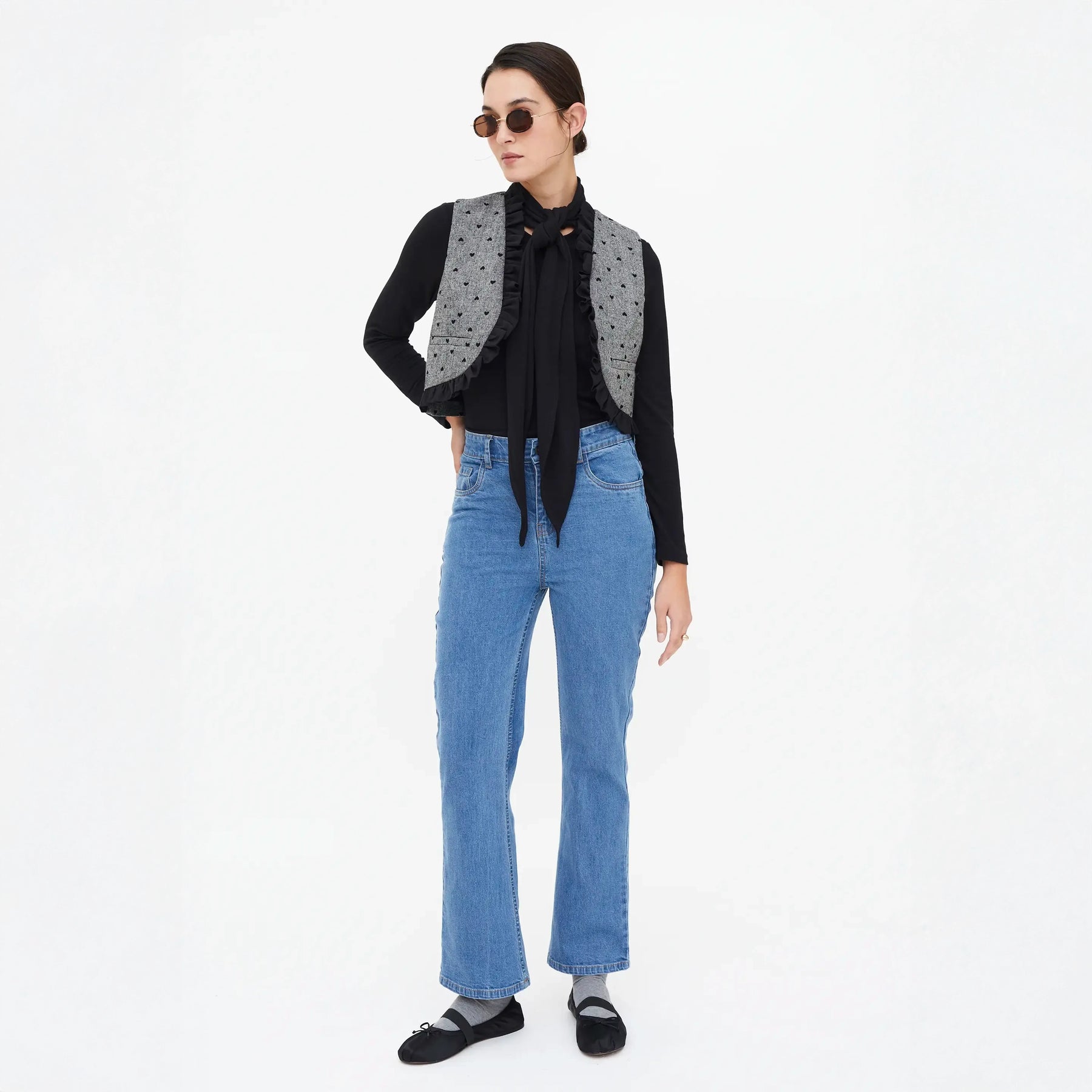 Este chaleco de tejido tweed combina elegancia y estilo con un encantador estampado de corazones en color negro. Su diseño abierto con volantes aporta un toque delicado y femenino, mientras que el forro interior asegura comodidad y un acabado impecable. Perfecto para darle un aire sofisticado y romántico a cualquier look. La modelo mide 177 cm y lleva la talla S, ideal para quienes buscan una prenda versátil y con personalidad.