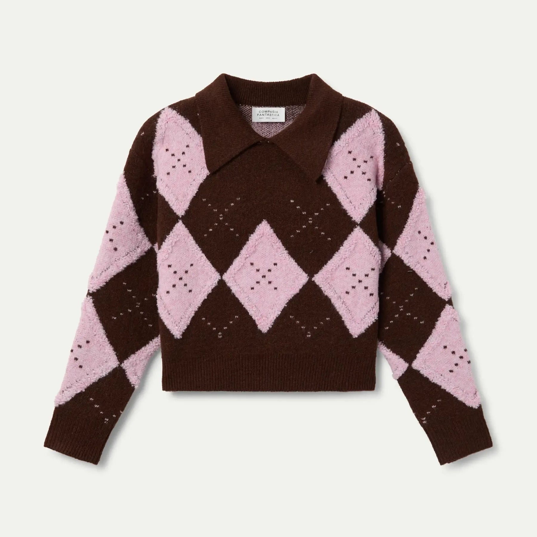 Este jersey de Compañía Fantástica combina un tejido jacquard en tonos rosado y marrón, diseñado para aportar estilo y comodidad. Su cuello solapa y manga larga ofrecen un ajuste elegante, mientras que el hombro ligeramente caído añade un toque relajado y moderno. Los detalles bordados en rombo junto con los acabados en rib realzan su carácter exclusivo, haciendo de esta prenda una opción versátil para cualquier ocasión.