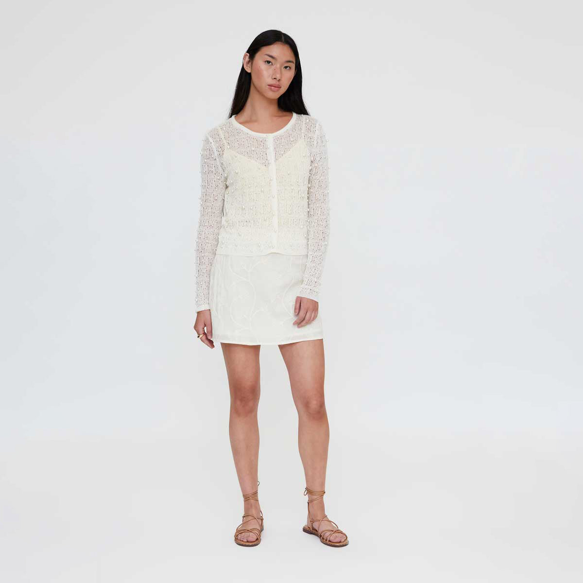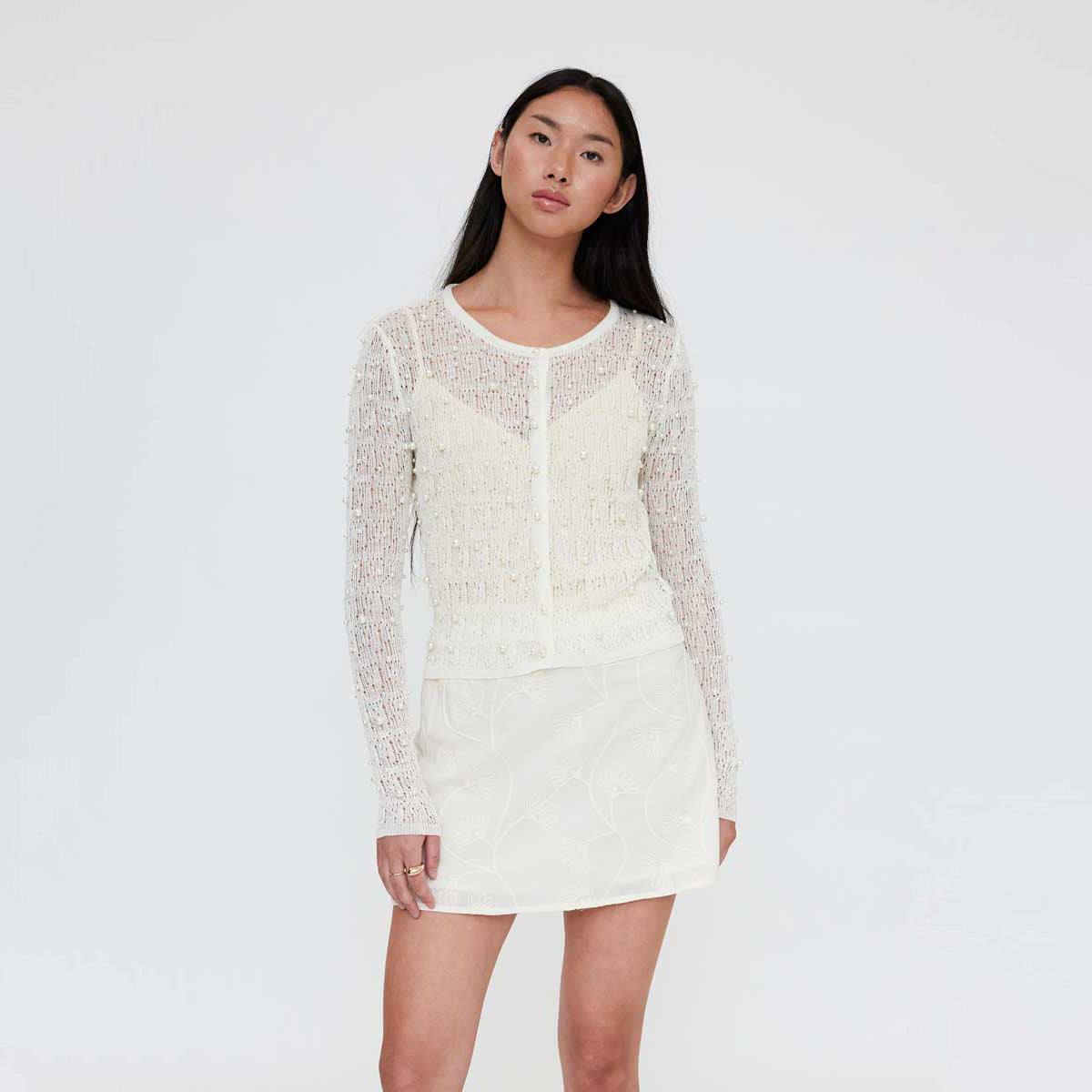 Descubre nuestro cárdigan Wild Pony, una prenda que combina elegancia y diversión. Confeccionado en punto calado blanco, destaca por sus delicadas perlas incrustadas que le dan un toque sofisticado y luminoso. Con manga larga y cuello redondo, ofrece comodidad total, mientras que los botones de perla añaden ese detalle especial que lo hace irresistible. Perfecto para elevar cualquier look con un toque de glamour desenfadado.
