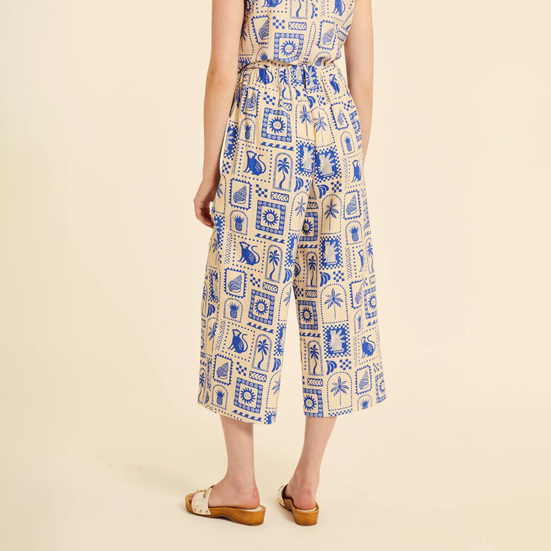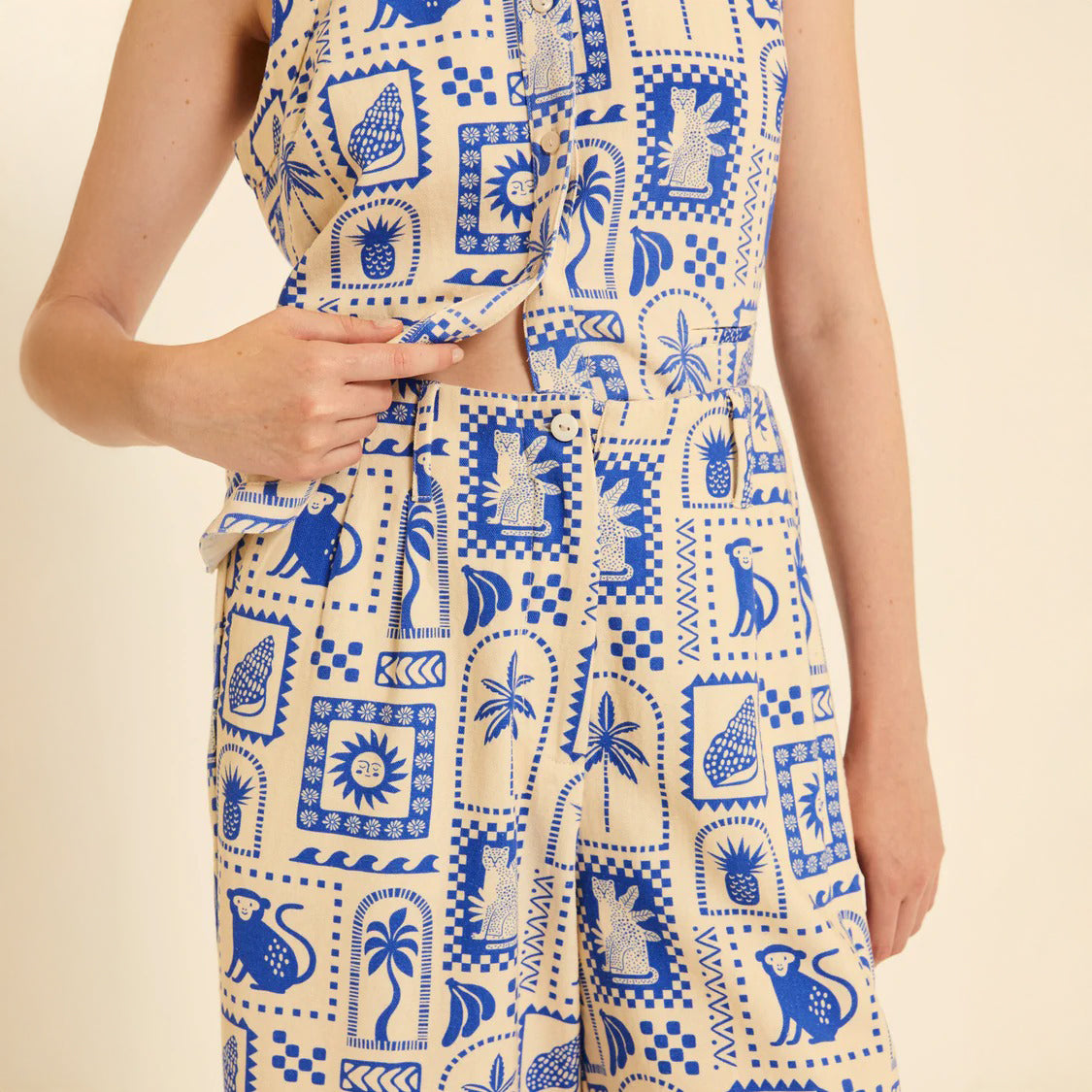 Pantalón Pepaloves con un vibrante estampado azul Morocco inspirado en la fauna y la flora. Diseño fresco y desenfadado perfecto para la temporada cálida. Cierre práctico con botones y bolsillos funcionales para mayor comodidad. Una prenda versátil que combina estilo y utilidad en cada uso.