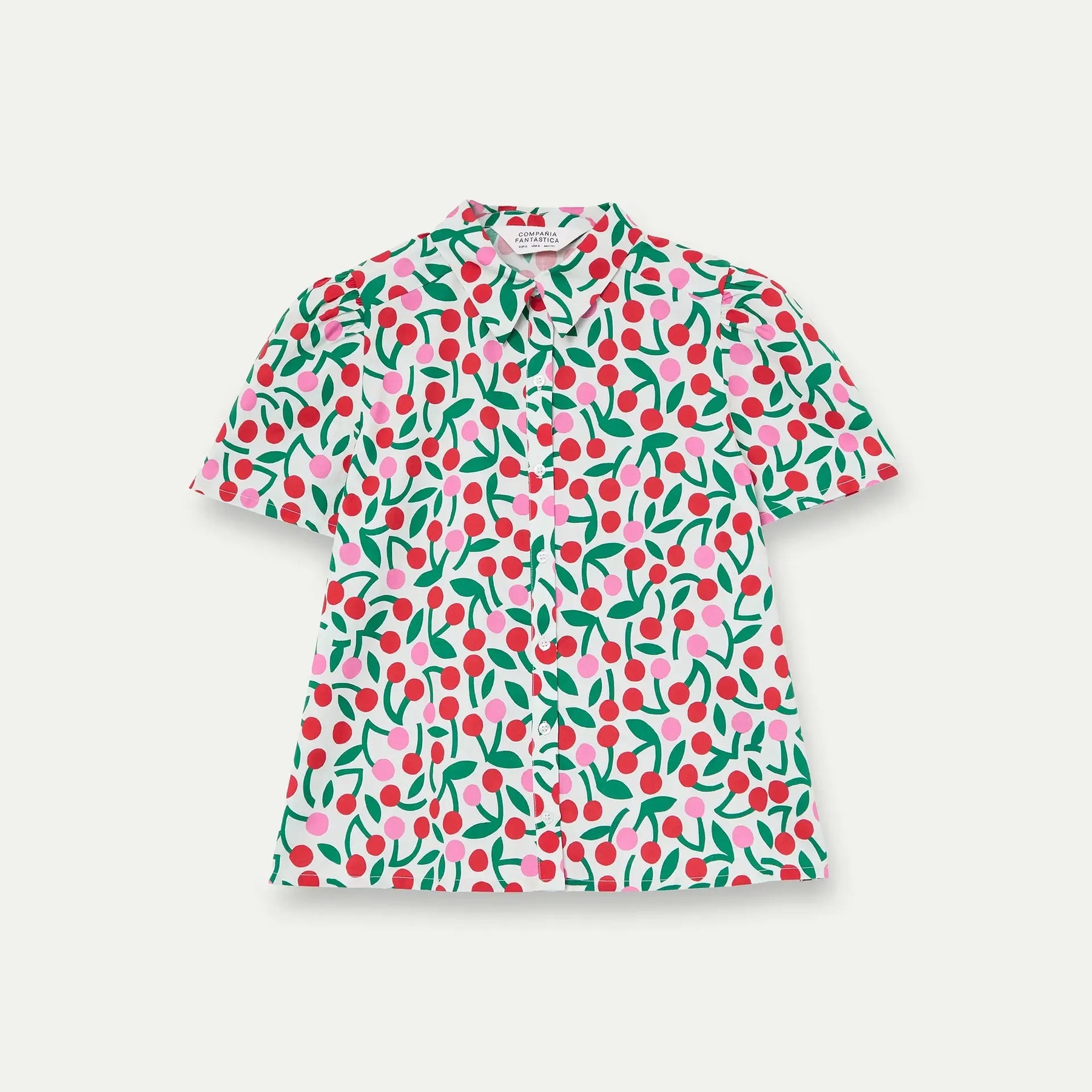 Descubre esta camisa de algodón puro que combina comodidad y estilo desenfadado. Su tela 100% algodón respira con cada movimiento, mientras que el estampado guinda le da ese toque de personalidad que buscas. El cuello solapa clásico y las mangas cortas ligeramente abullonadas crean una silueta moderna y coqueta. Los botones blancos rematan el diseño con elegancia casual. Perfecta para días relajados con mucho carácter.