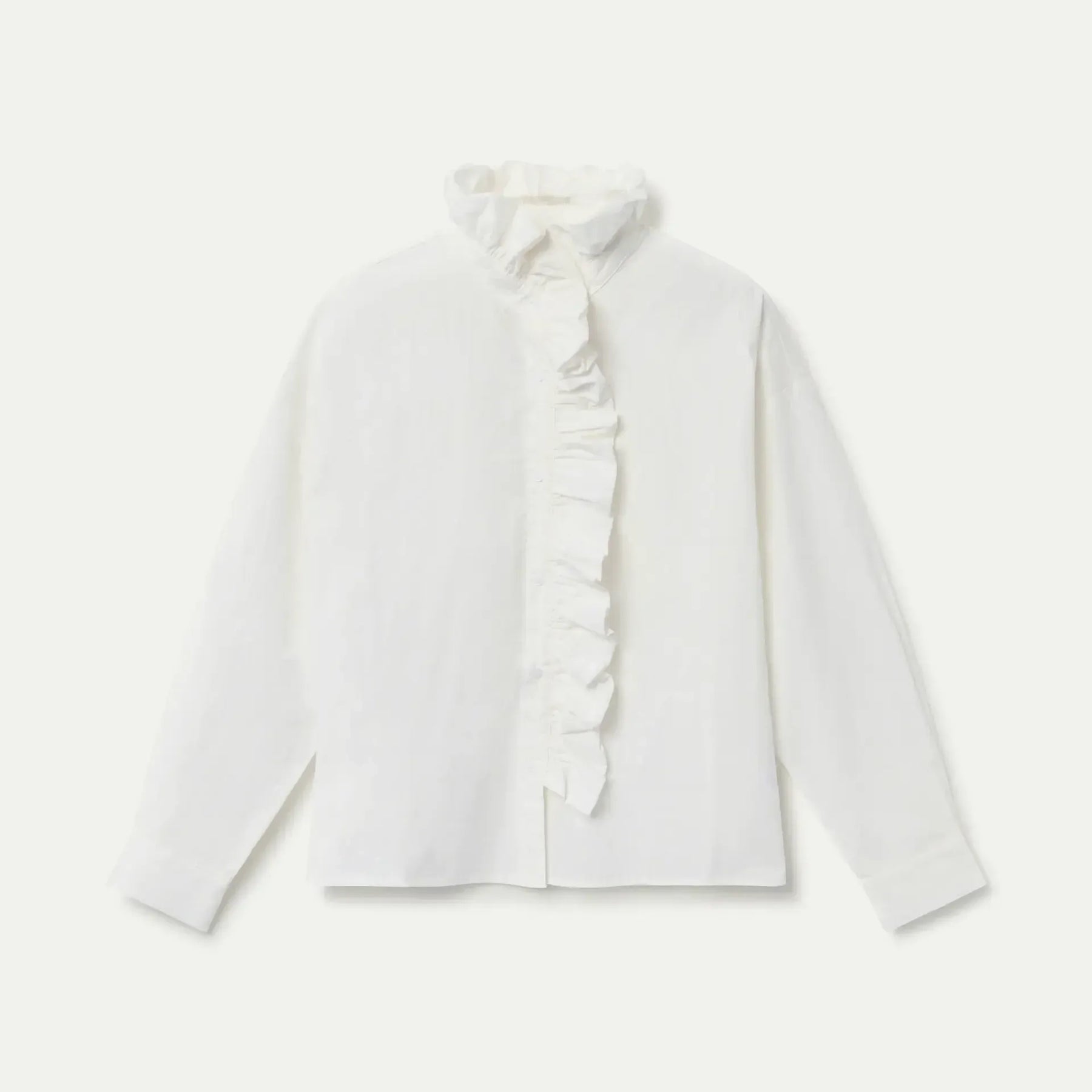 Esta camisa blanca de Compañía Fantástica combina elegancia y comodidad gracias a su tejido 100% algodón, suave y transpirable. Su cuello alto con delicados volantes y las mangas largas con puño abotonado añaden un toque sofisticado, mientras que el cierre frontal con botones y detalles en volantes realzan el diseño femenino. Perfecta para cualquier ocasión, aporta un estilo único y refinado a tu armario.