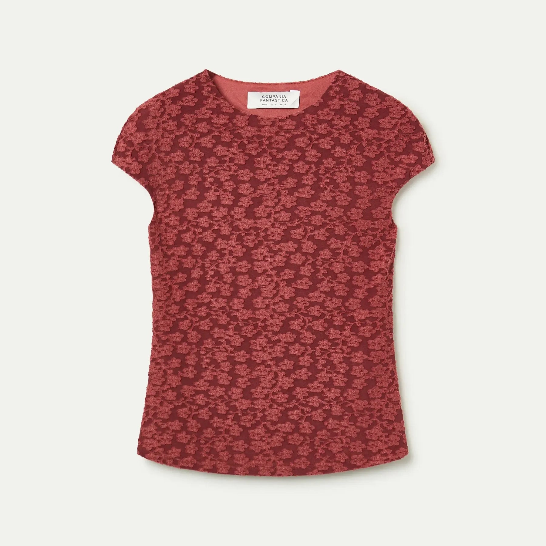 Descubre esta camiseta de Compañía Fantástica, confeccionada en tejido punto con delicado encaje floral marrón. Su diseño de cuello cerrado y manga larga aporta un toque elegante y sofisticado, mientras que el forro interior garantiza comodidad durante todo el día. Perfecta para combinar en cualquier ocasión, esta prenda realza tu estilo con un acabado único y femenino.