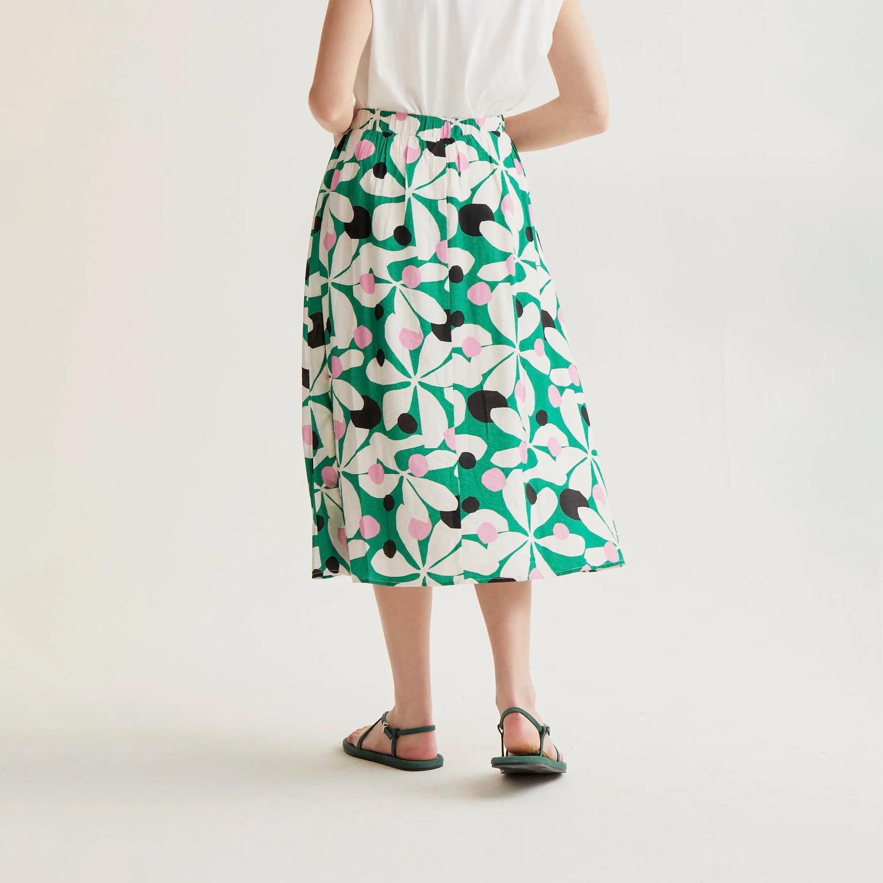 Descubre nuestra falda midi que combina elegancia y comodidad en cada paso. Confeccionada en tejido crepé ligero, luce un cautivador estampado floral hosta que trae la naturaleza a tu armario. La cintura elástica de tiro alto se ajusta perfectamente a tu silueta, mientras que el corte fluido permite movimiento sin restricciones. Con forro interior incluido, esta prenda es tu aliada perfecta para looks sofisticados que funcionan tanto en el día como en la noche. ¡Prepárate para girar cabezas!