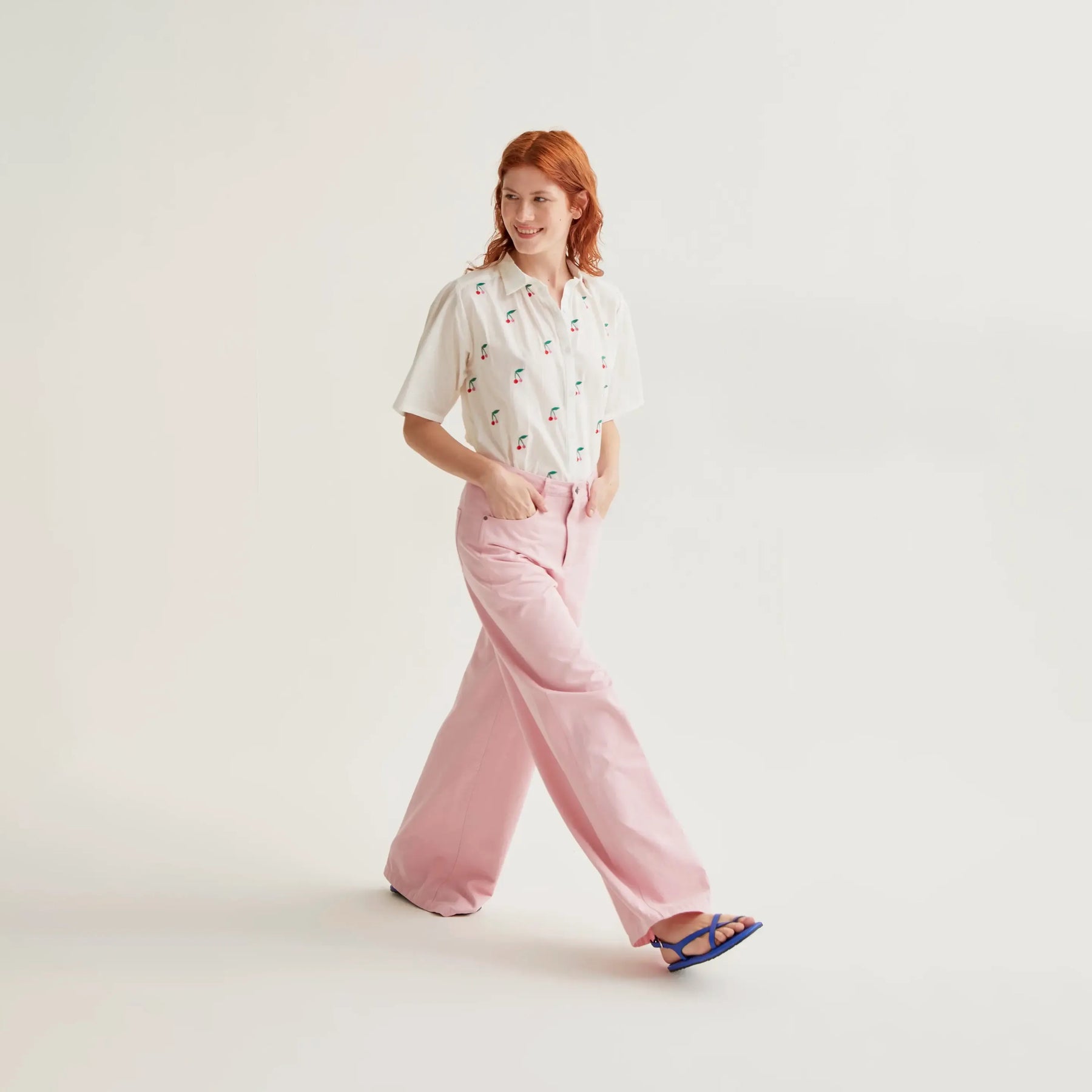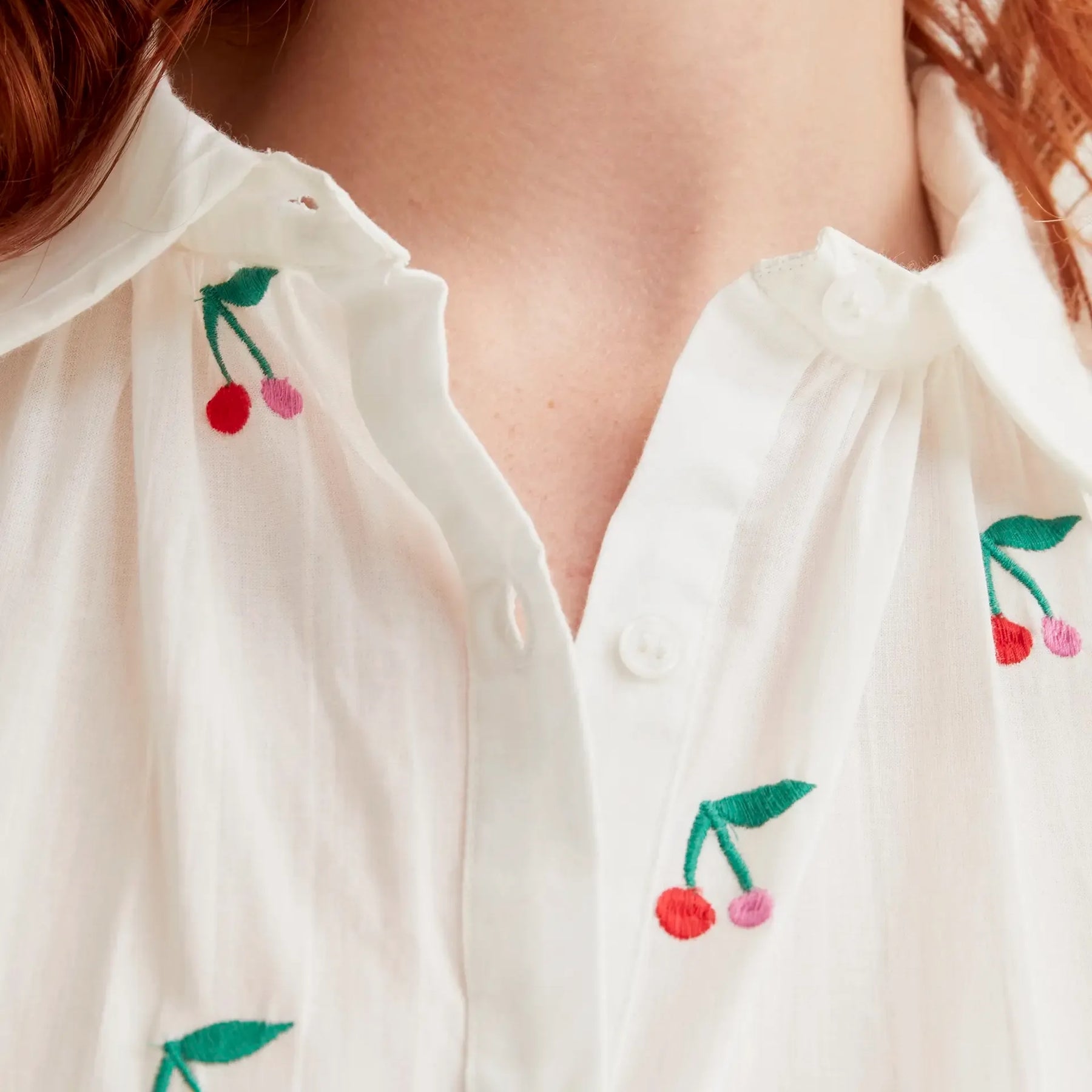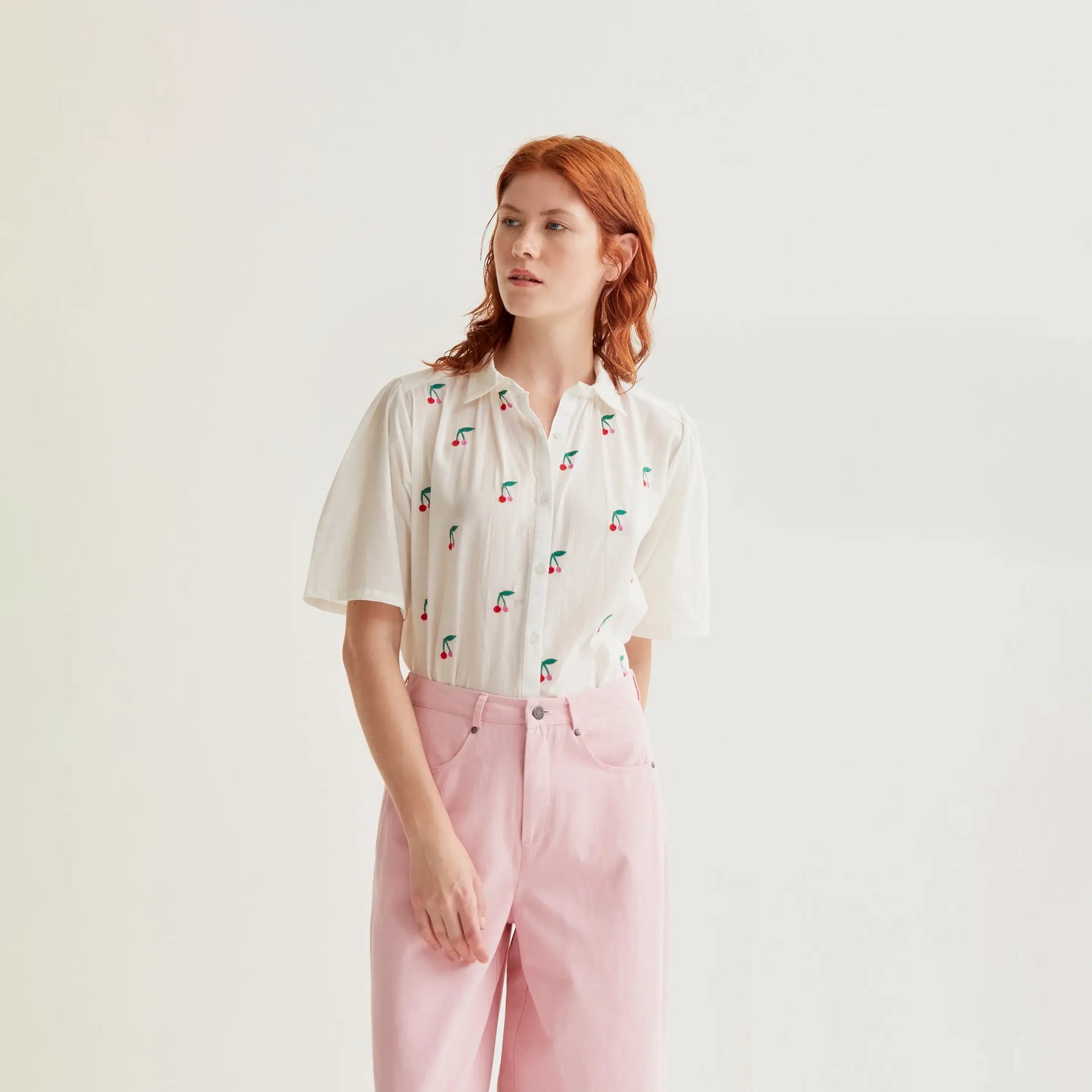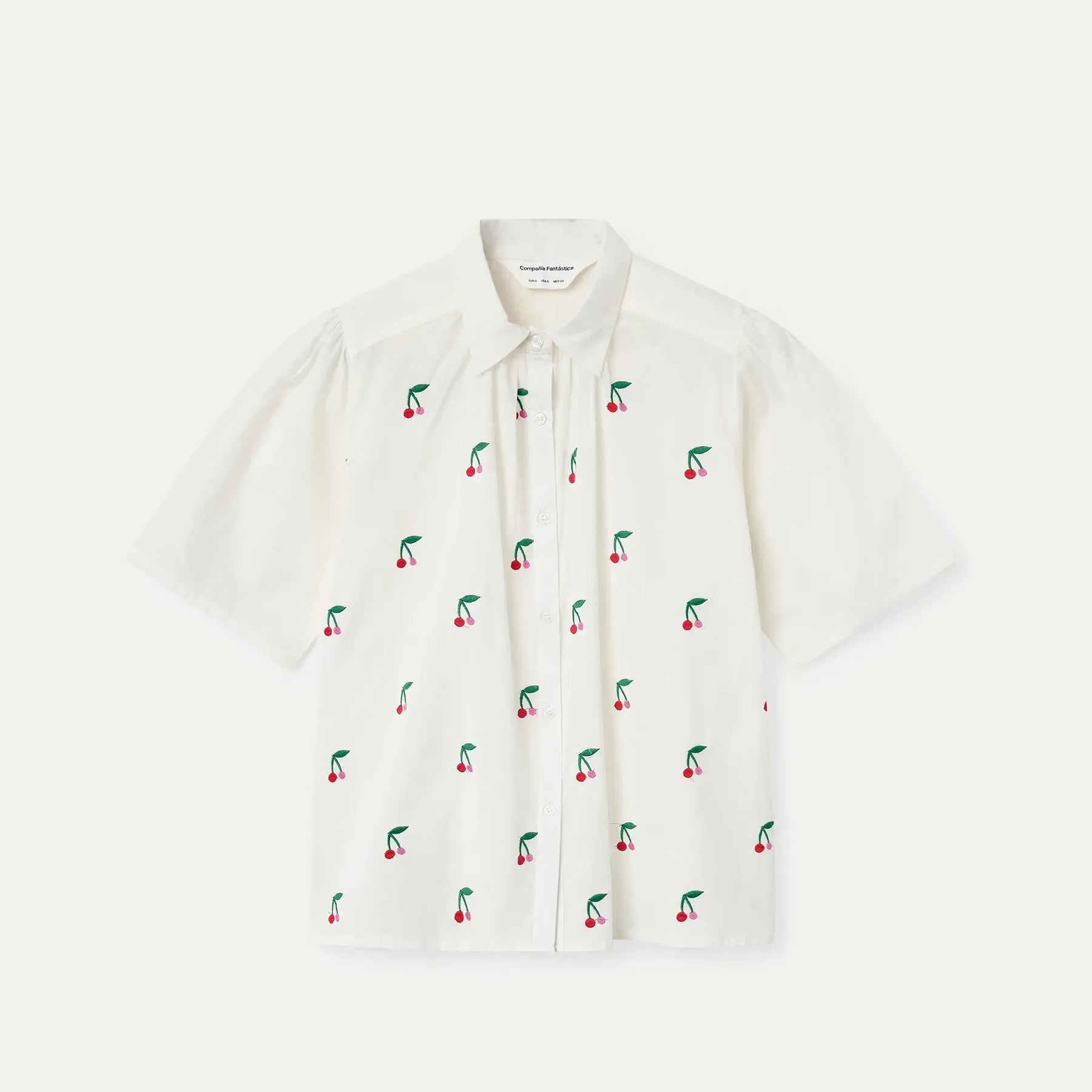 Descubre esta camisa blanca de Compañía Fantástica que combina comodidad y estilo con un toque frutal. Confeccionada en 100% algodón puro, luce un encantador estampado de cerezas blancas que le da personalidad. El cuello solapa clásico y las mangas cortas ligeramente abullonadas crean un look relajado y moderno. Los botones blancos a juego cierran el frente de forma impecable. Perfecta para días casuales con ese toque de diversión que buscabas.