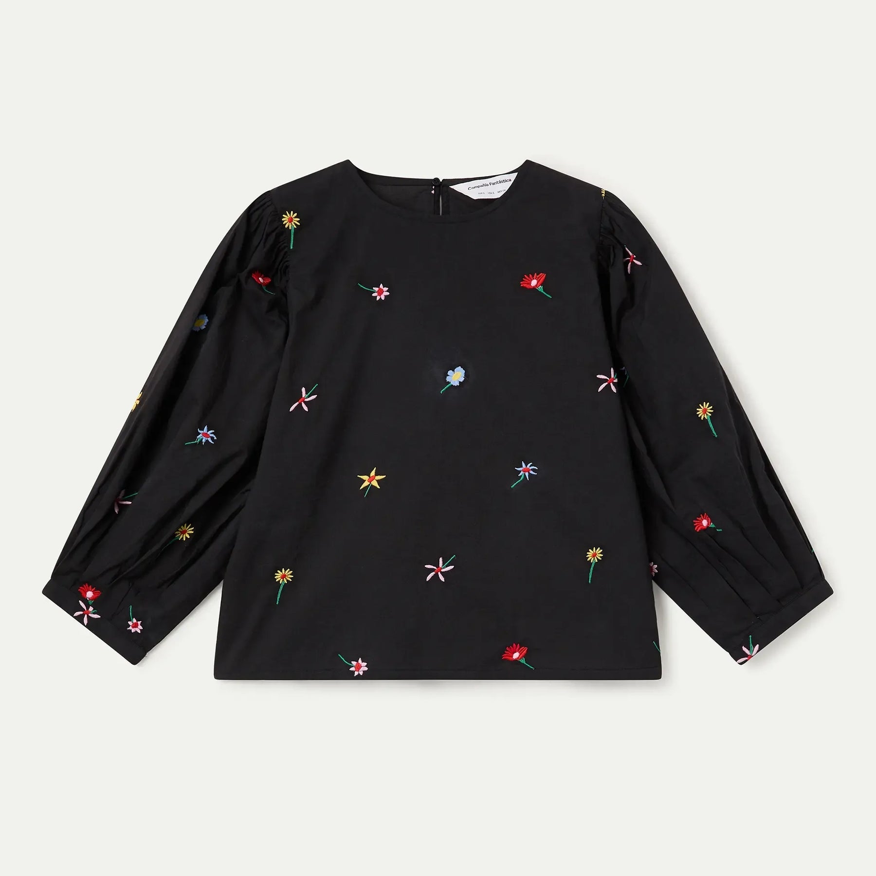 Blusa de corte elegante con estampado Black Gardener Flowers que combina sofisticación y naturaleza. Cuello redondo clásico y mangas ligeramente abullonadas al estilo francés para un toque romántico. Cierre posterior discreto con botón oculto que mantiene las líneas limpias. Flores bordadas que añaden textura y detalle artesanal. Pieza versátil perfecta para crear looks modernos con carácter.