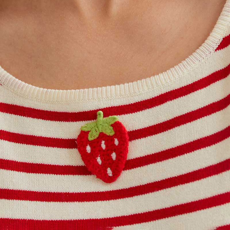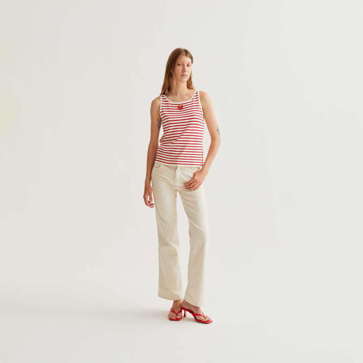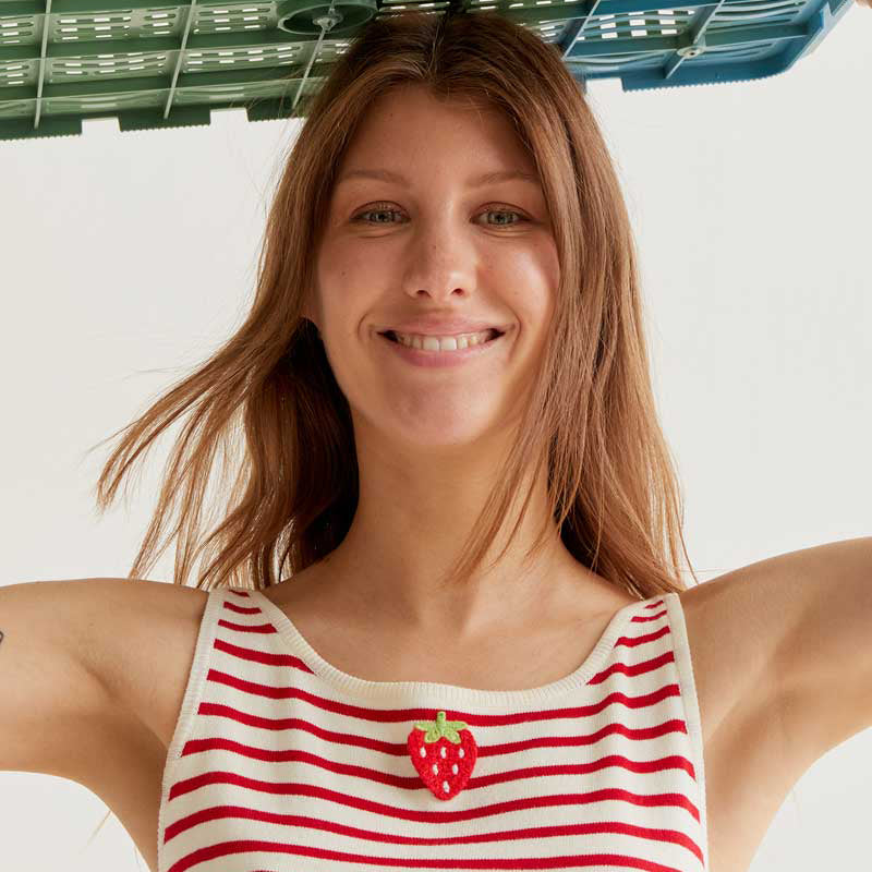 Descubre nuestro top de tirantes con un toque de diversión. Combina rayas clásicas en blanco y rojo con un adorable bordado de fresa que le da ese toque especial y diferente. Perfecto para los días soleados, ya sea para pasear por la ciudad o disfrutar de un plan casual con estilo. Un básico con personalidad que no puede faltar en tu armario.