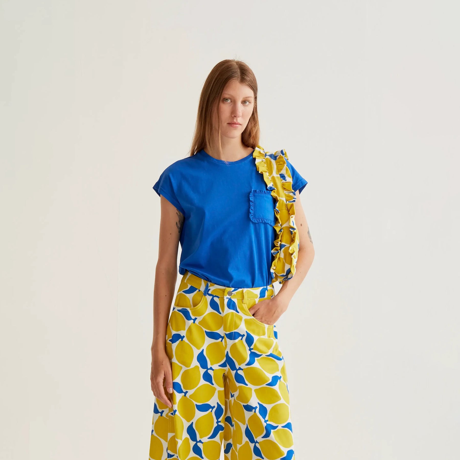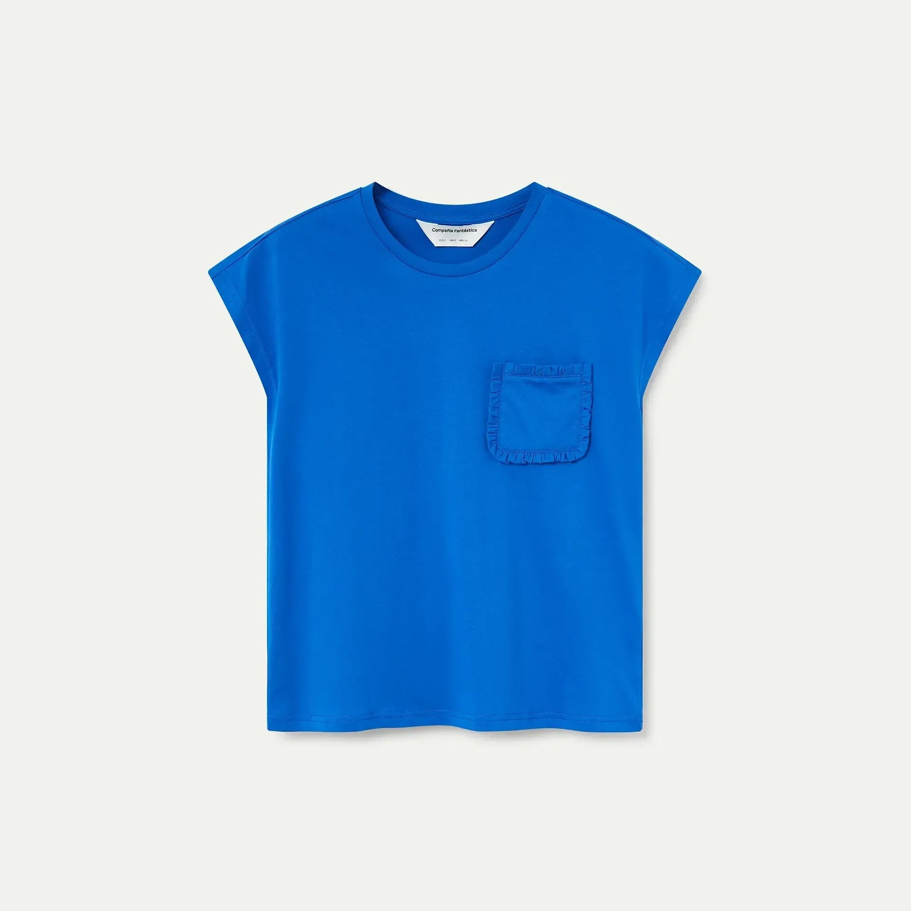 Camiseta de manga corta confeccionada en 100% algodón de alta calidad en tono azul. Diseño clásico con cuello redondo que proporciona comodidad y versatilidad. Destaca por su bolsillo frontal adornado con volantes, un detalle que añade un toque distintivo y femenino a la prenda. Perfecta para combinar con cualquier look casual.