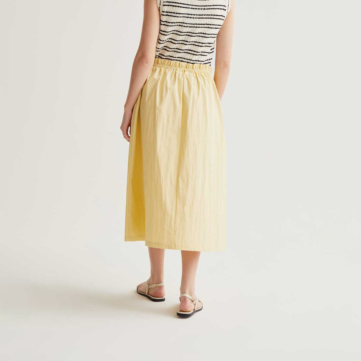 Descubre nuestra falda midi en un amarillo claro que ilumina cualquier look. Confeccionada en tejido encerado con un acabado brillante y resistente, esta prenda combina estilo y practicidad. La cintura elástica garantiza comodidad durante todo el día, permitiéndote moverte con libertad. Perfecta para crear outfits versátiles, desde casual hasta más elaborado. Una pieza imprescindible que añade ese toque de color alegre a tu guardarropa.