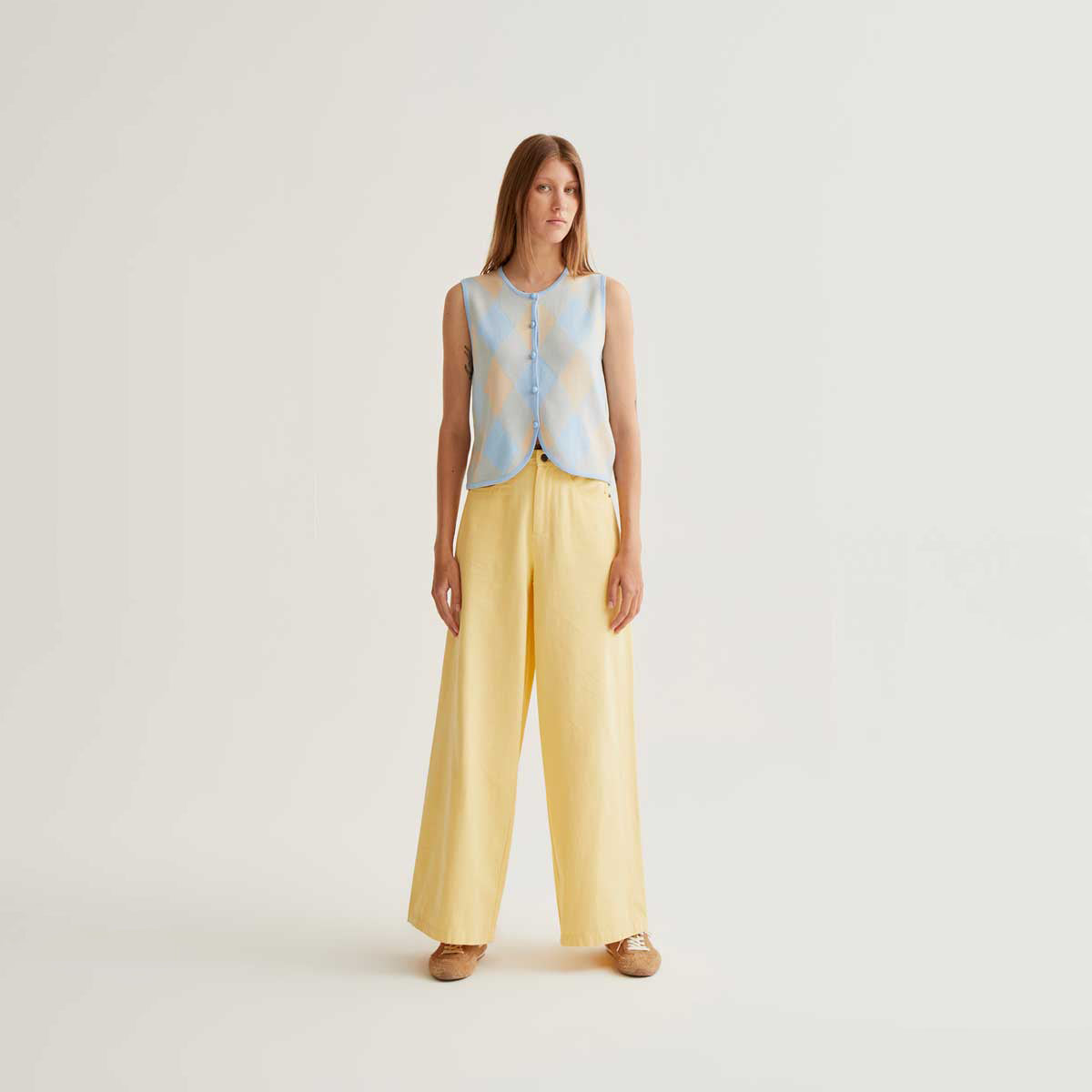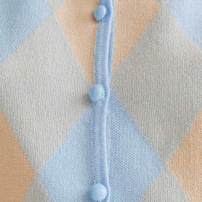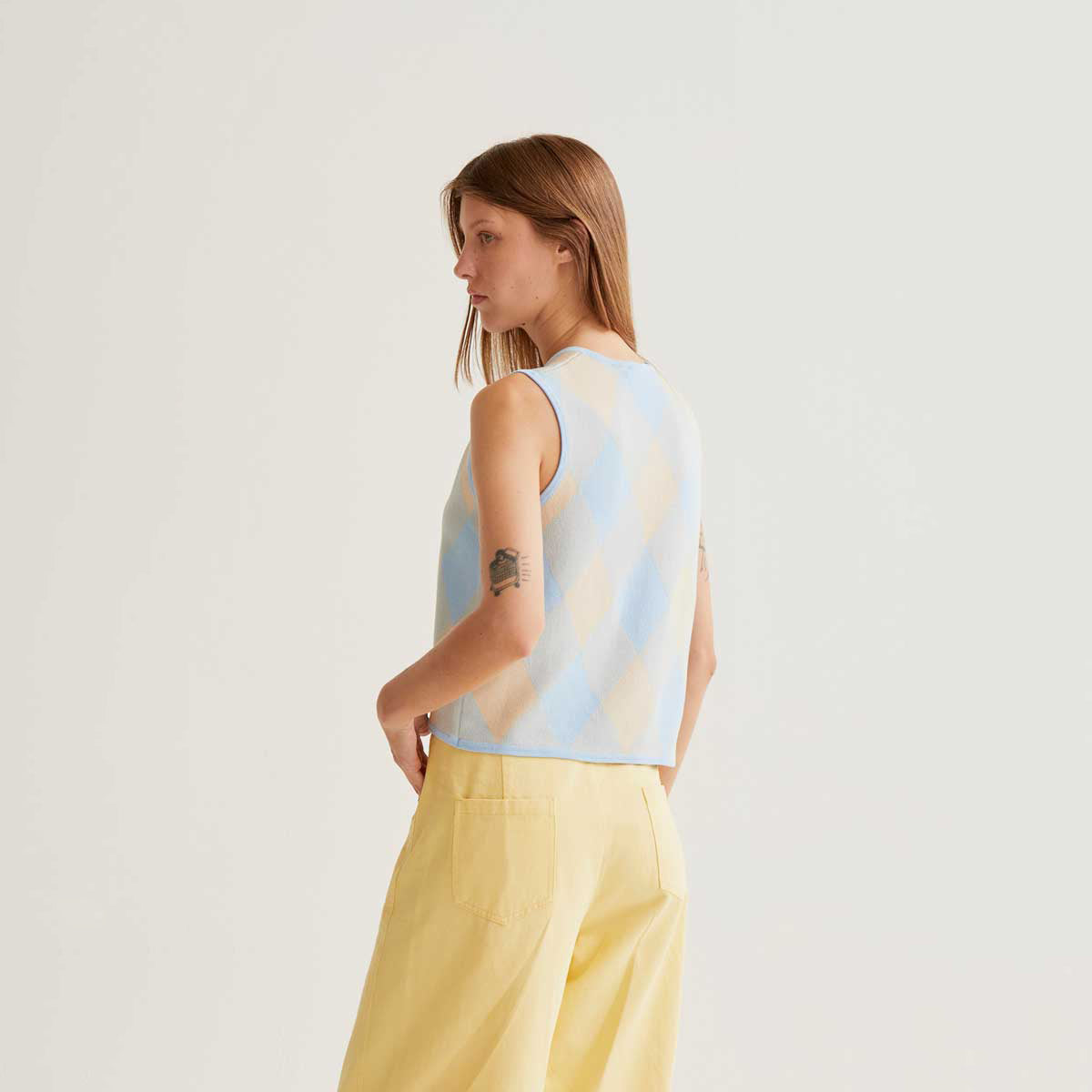 Top sin mangas confeccionado en punto con un elegante patrón de rombos en tonos azul y beige. Diseño versátil con cierre abotonado que facilita su uso. Combina perfectamente con el pantalón a juego para crear un conjunto coordinado y sofisticado. Ideal para looks casuales y modernos que destacan por su estilo geométrico y colores neutros.