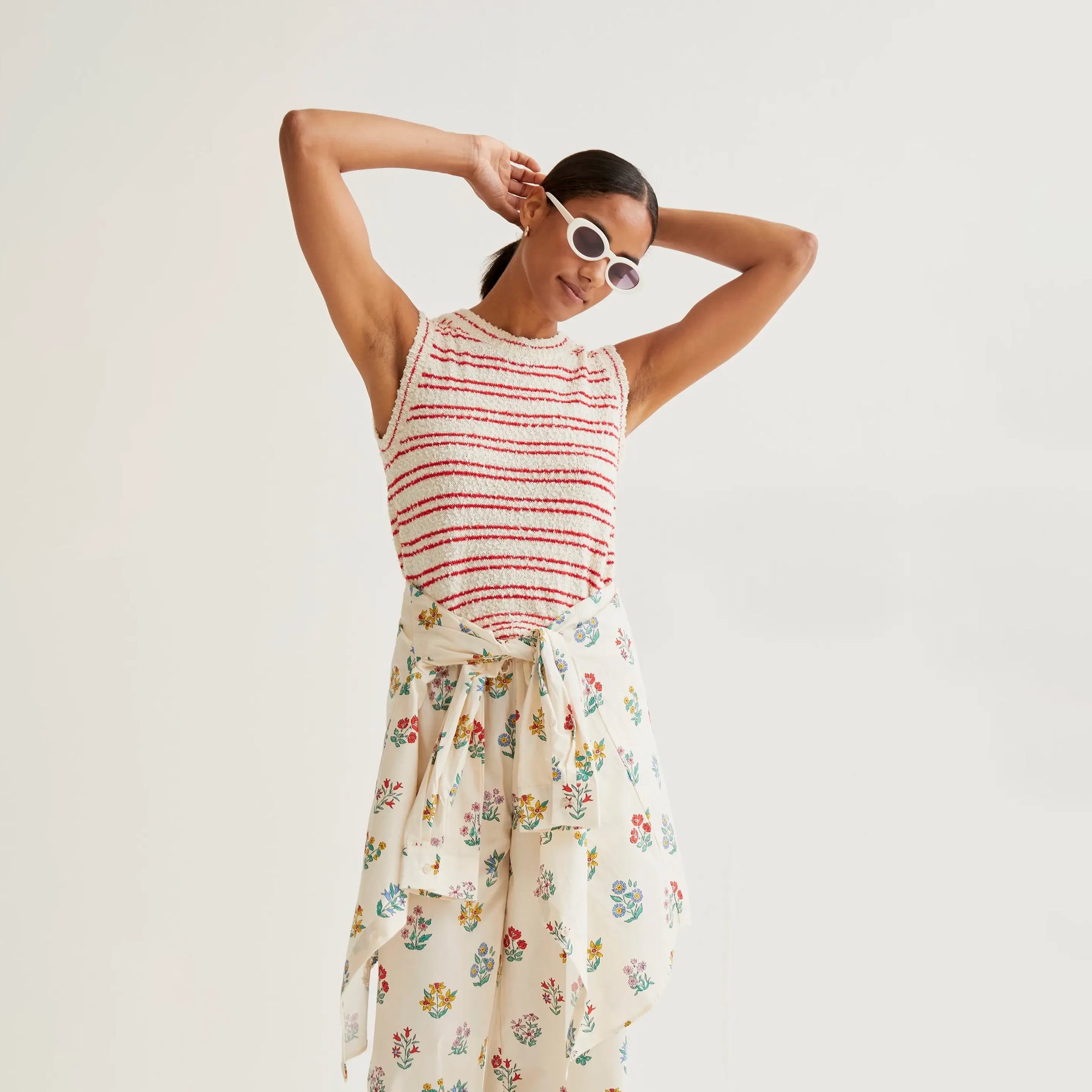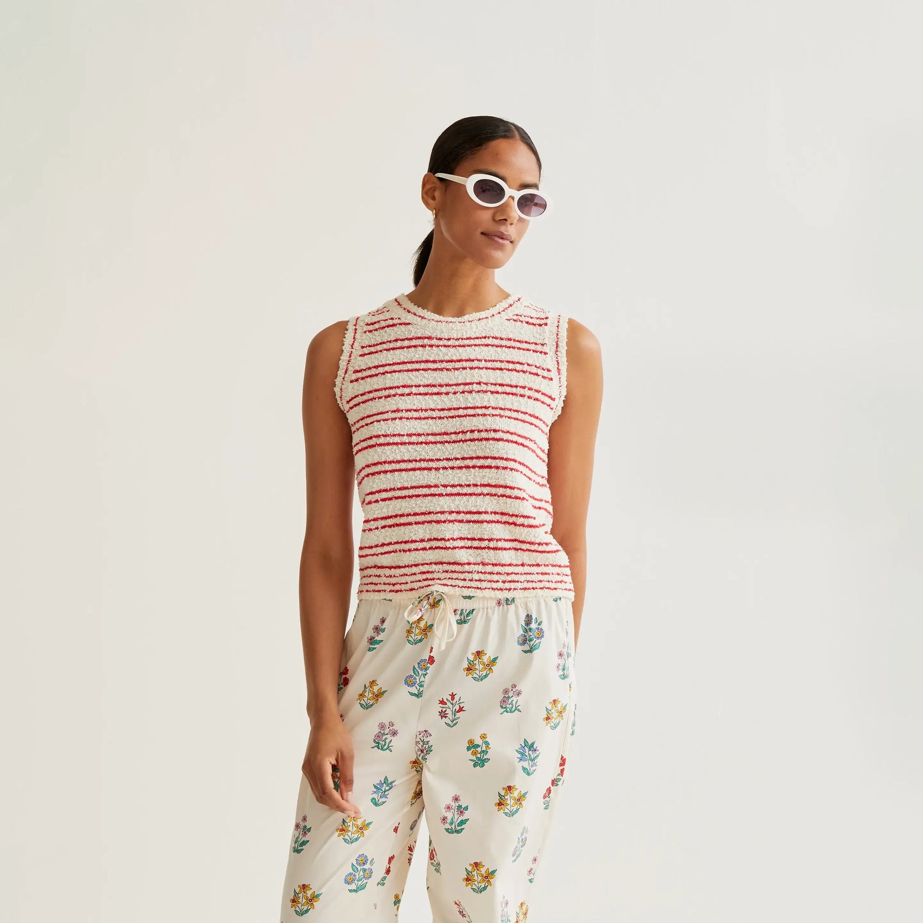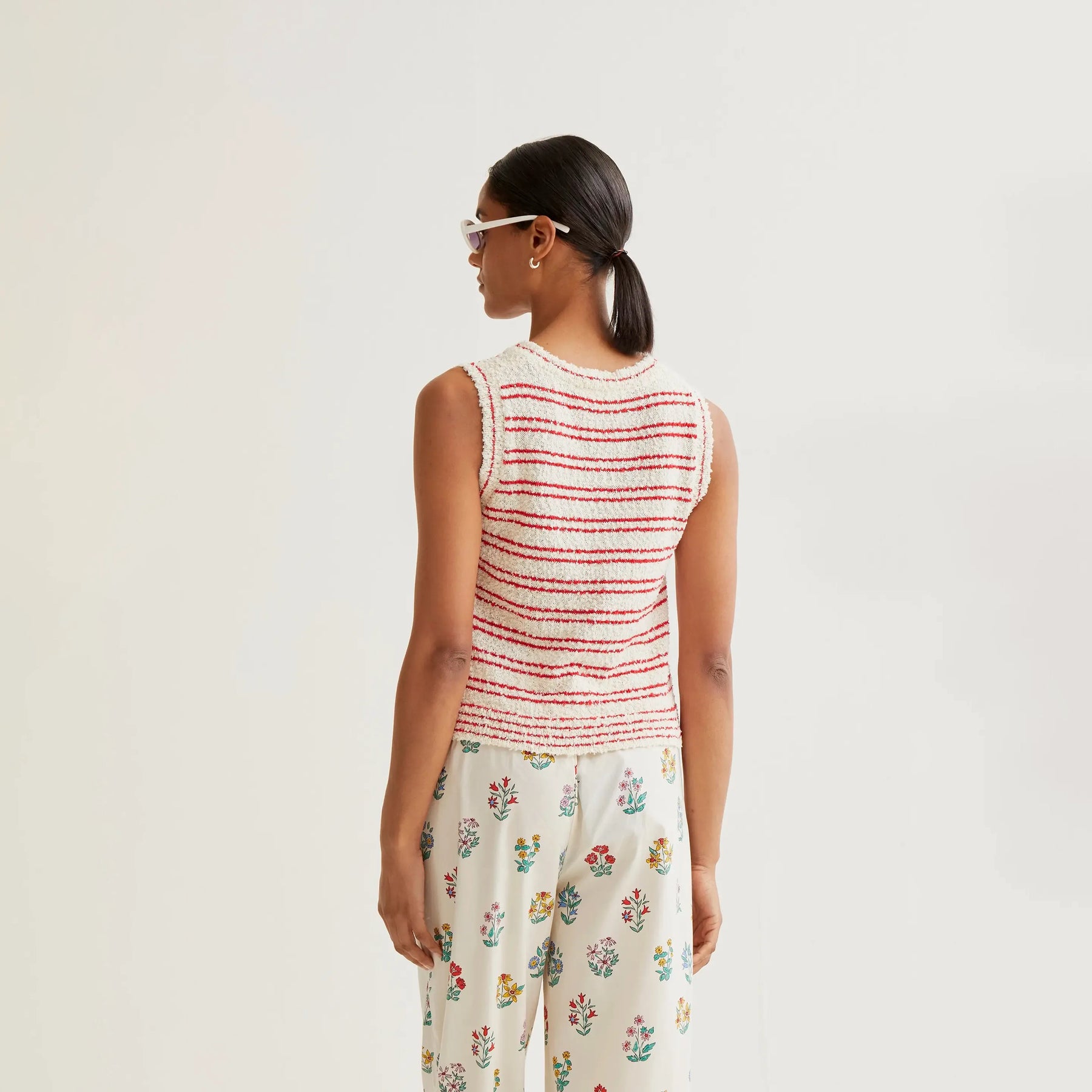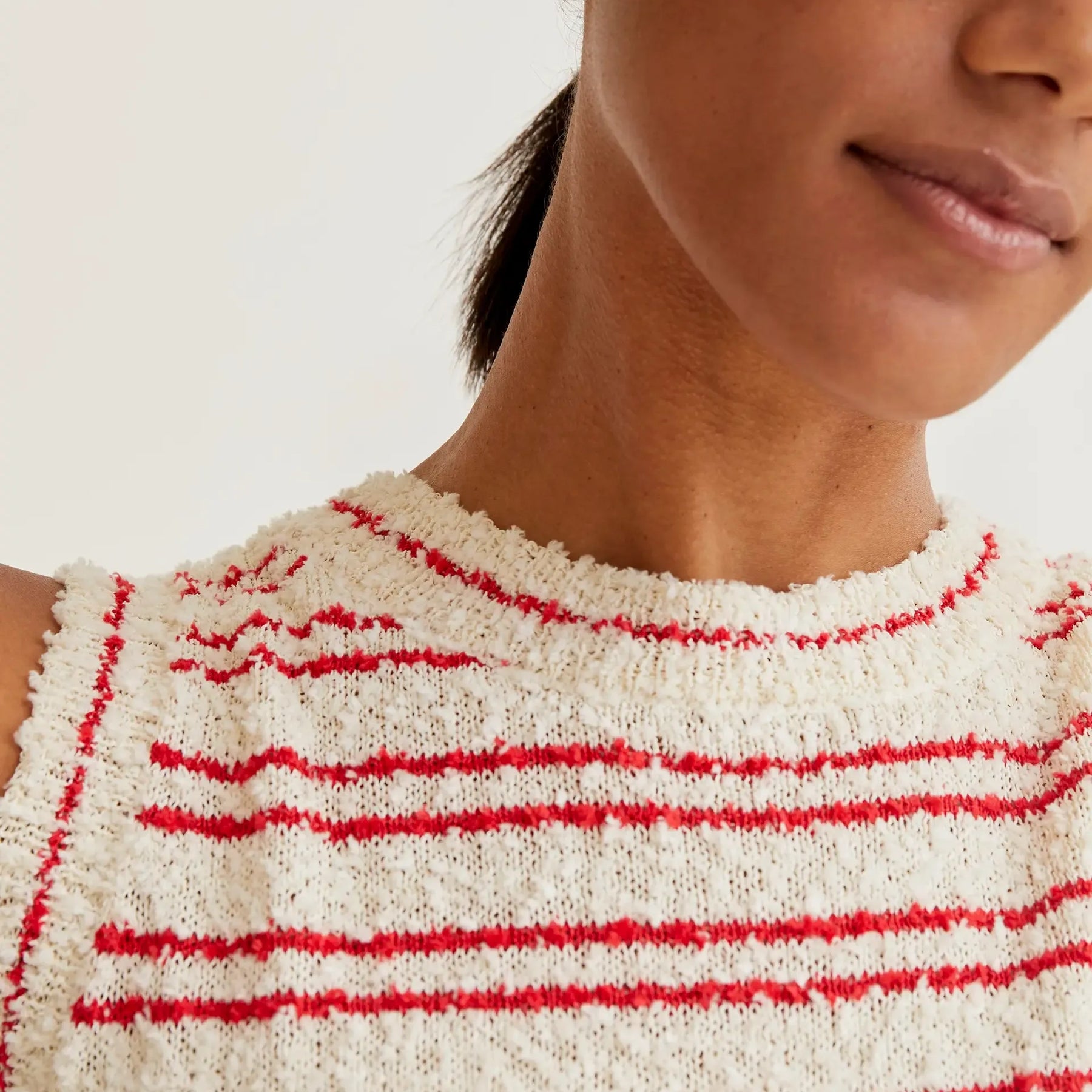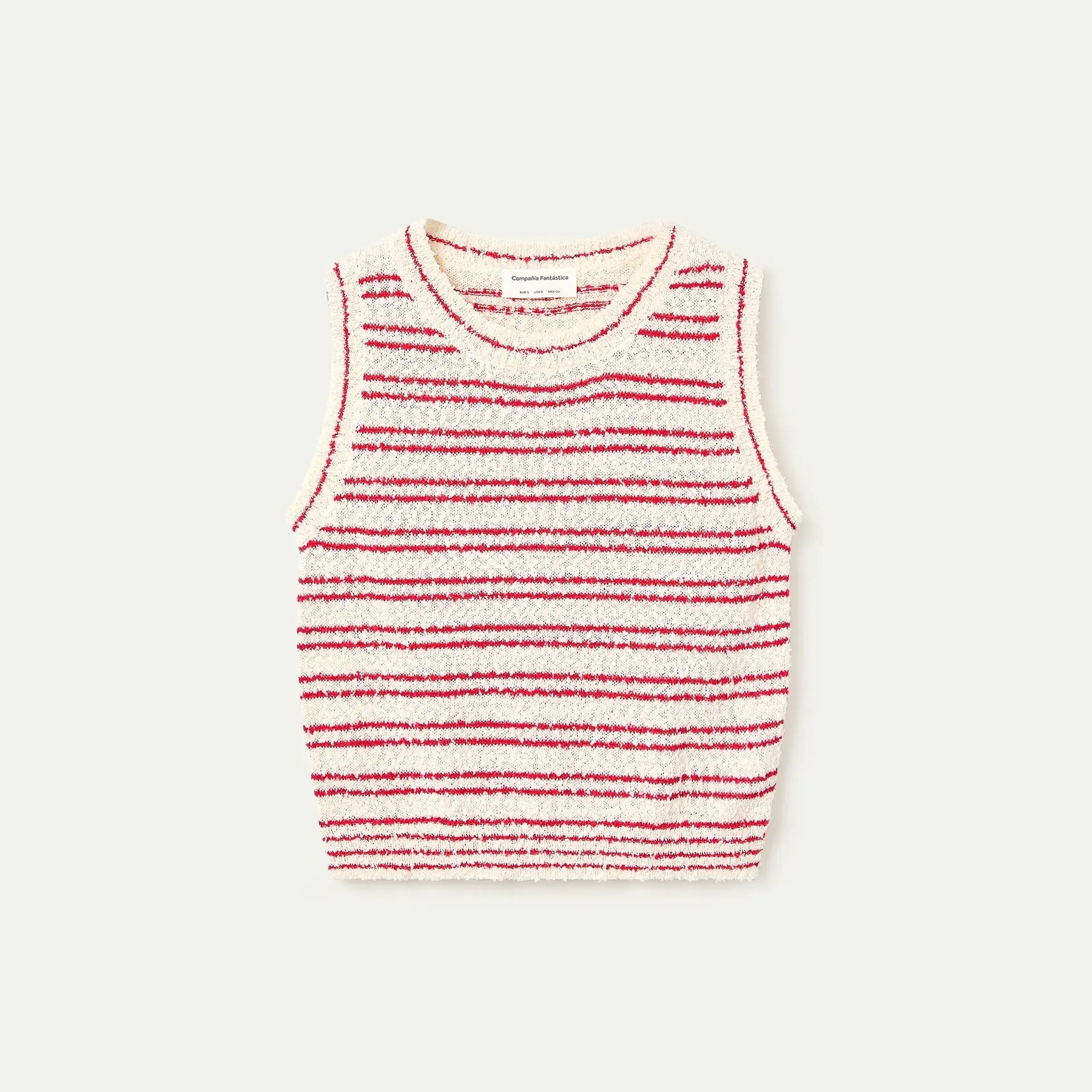 Top sin mangas confeccionado en punto texturizado que combina comodidad y estilo. Presenta rayas rojas horizontales que crean un efecto visual dinámico, mientras que el cuello redondo ofrece un acabado clásico y versátil. Perfecto para crear looks casuales o más elaborados según la ocasión. Una prenda esencial que se adapta a cualquier guardarropa.